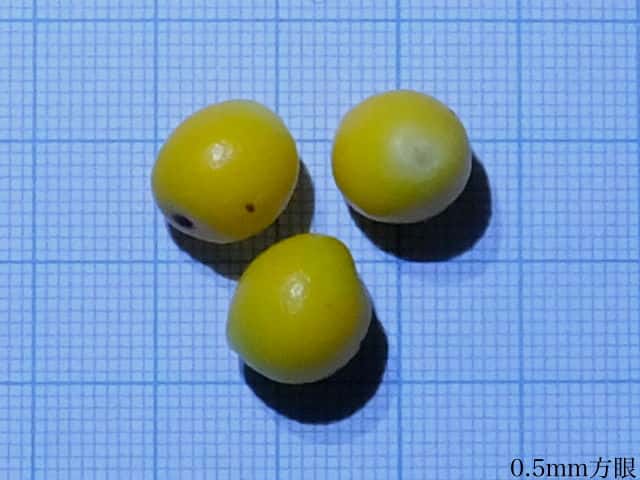 | ▼果実は長さ約6mm、頂部に柱頭、横に雄しべの痕跡がある。 | ▼核は1個入り、長さ約4mm。 | |