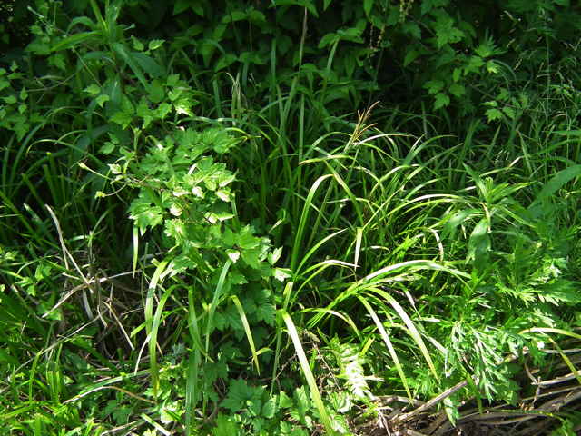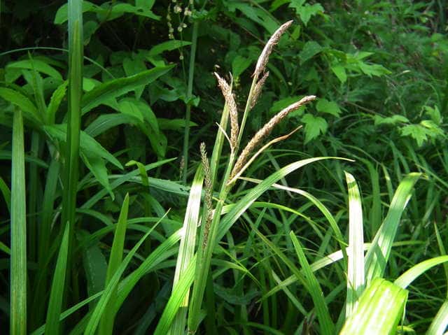 多年草 本州(近畿以西)の山地の河畔や湿地に生える。横走する地下茎があり群生する。基部の鞘は淡色で一部赤紫色を帯びることがある。葉はやややわらかく幅4〜8mm。有花茎はは高さ30〜70cm。頂小穂は雄性、長さ3〜7cm。側小穂は雌性、長さ3〜12cm。雌花および雄花の鱗片には赤紫色の部分があり、鋭頭芒端、果胞より長い。果胞は長さ3〜4mm、無毛まれに有毛、熟しても膨らまず、乾くとやや褐色に変色する。花柱は細長く、宿存し、柱頭は3岐。果期は5〜6月。(日本のスゲ) 学名は、Carex dispalata カヤツリグサ科スゲ属ミヤマシラスゲ節 |
