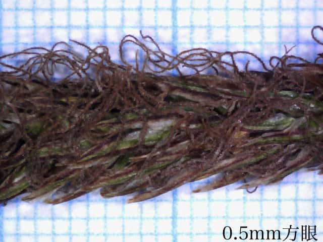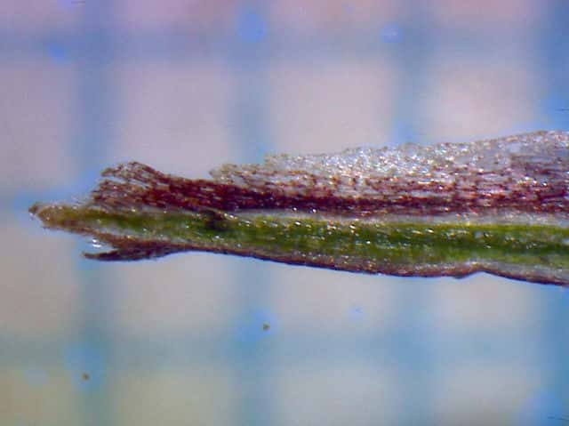 | ▼鱗片は長さ約3.5mm。 | ▼鱗片の先は尖り、短い芒となる。 | ▼未熟な果胞は長さ約2.8mm。 |
