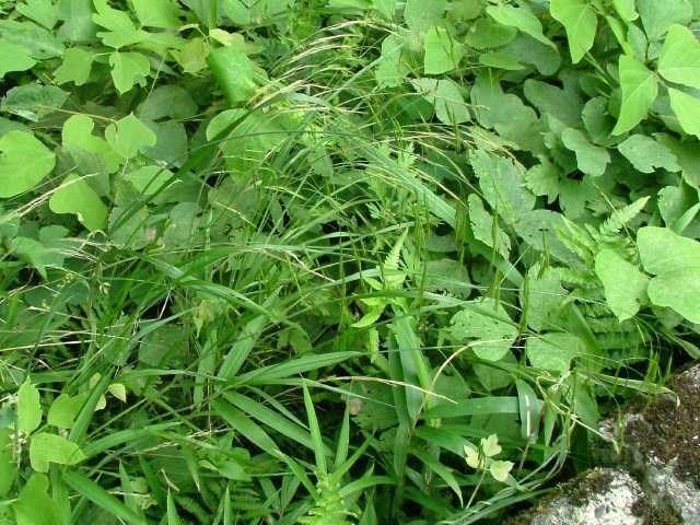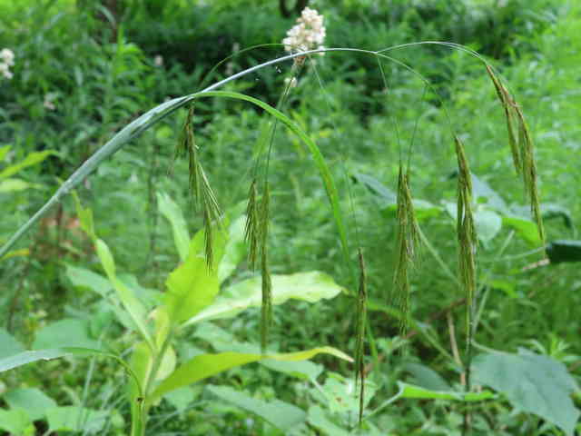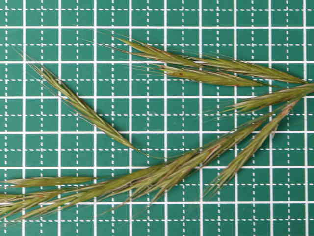 多年草 北海道〜九州の原野に生育し、散生またはやや群生する。茎は高さ50〜100cm。直立・叢生、暗緑色を帯び細毛がある。葉は長さ30〜40cm、幅5〜6mm、深緑色、表面に毛を生じる。葉舌は膜質、短く切形。葉鞘の縁は癒合して筒状になり、逆向きの毛をつける。花序はまばらな円錐形で、各節から3個の細い枝を出し、その先に少数の小穂をつけ、下垂する。小穂は披針形、長さ3〜4cm、無毛、6〜8小花からなり、各小花に長い直立する芒がある。包穎は線状披針形、鋭頭、長さはそれぞれ5〜7mm、8〜12mm。果実は線形、暗褐色、無光沢。花期は6〜7月。(日本イネ科植物図譜) 学名は、Bromus remotiflorus イネ科スズメノチャヒキ属 |