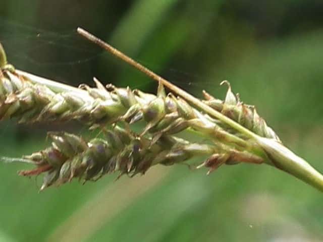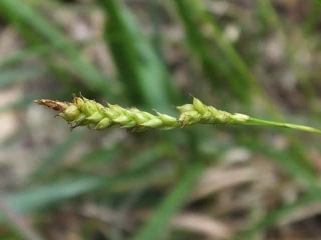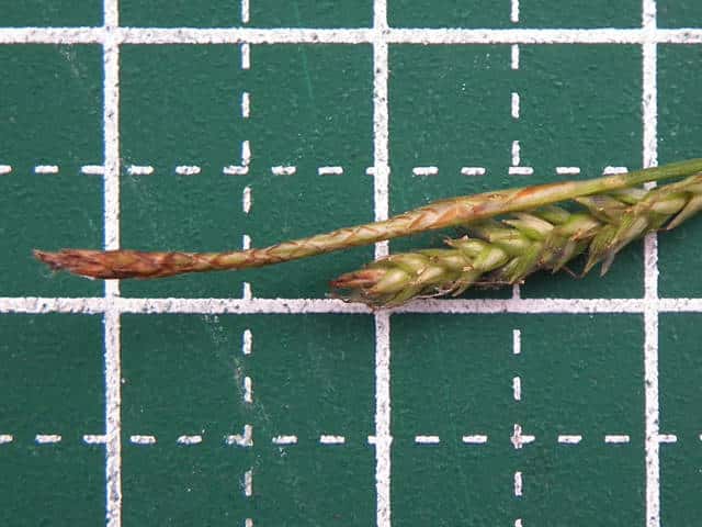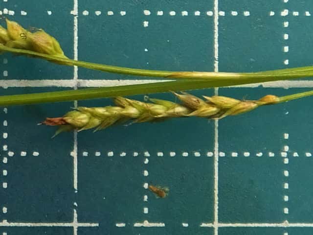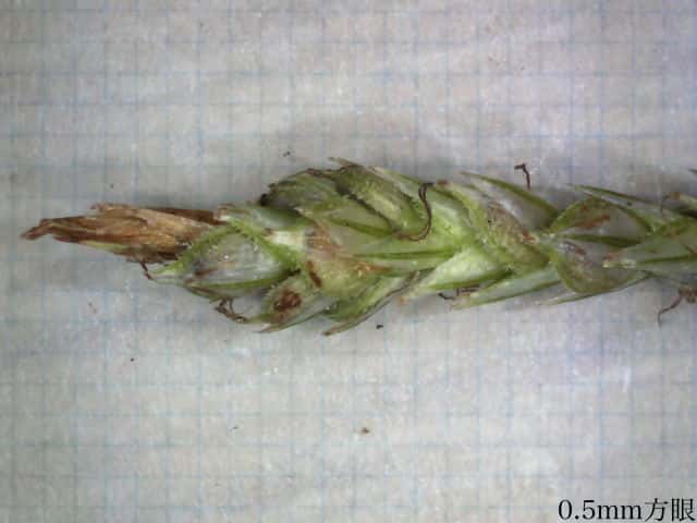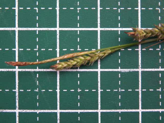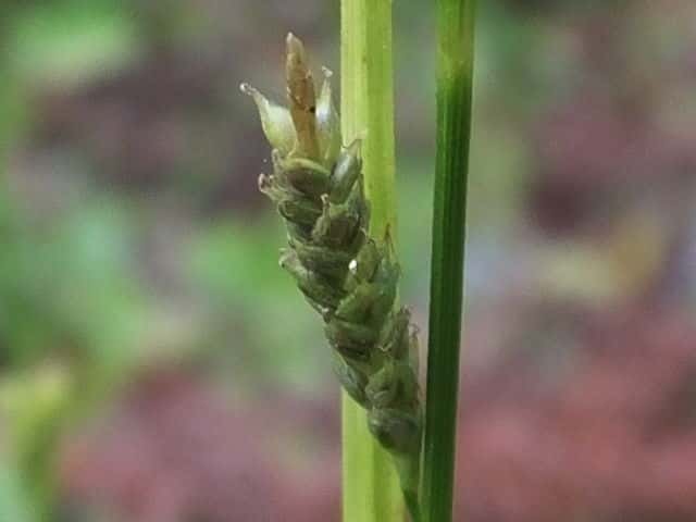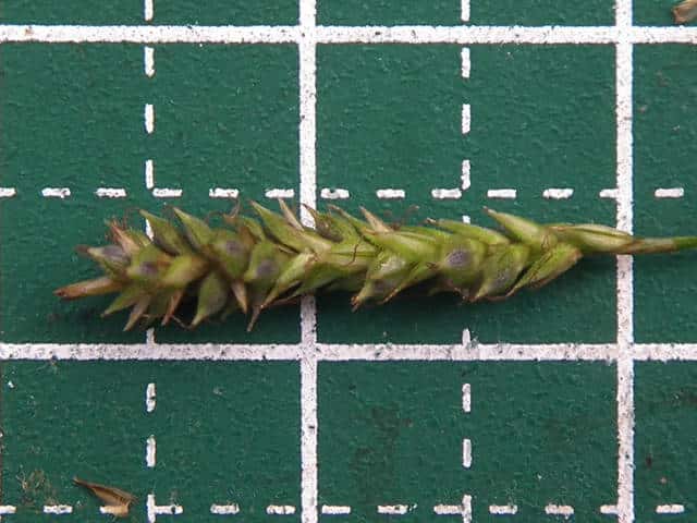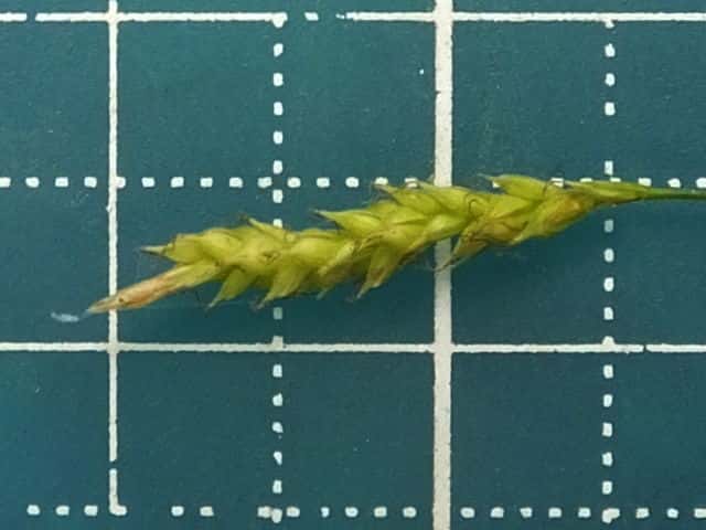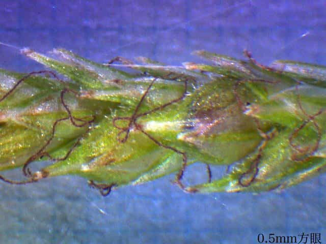 | ▼小穂は長さ1.7cm。 | ▼小穂は雄雌性、先端に雄花部がある。 | ▼果胞は長さ2.1〜2.5mm。 |