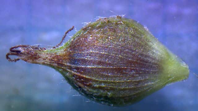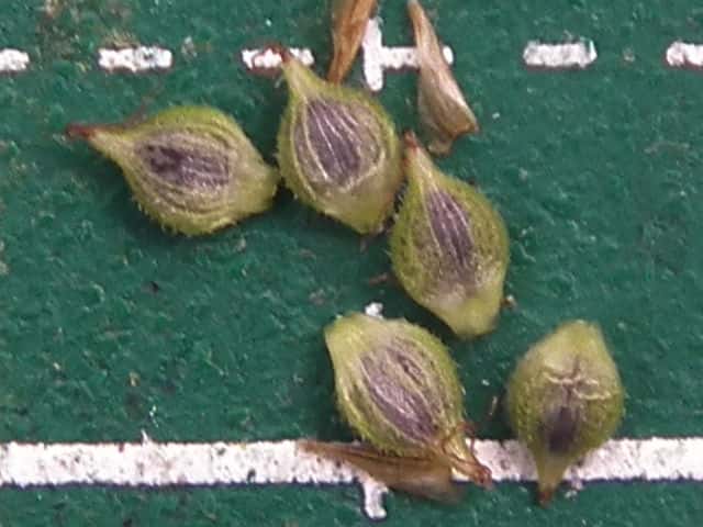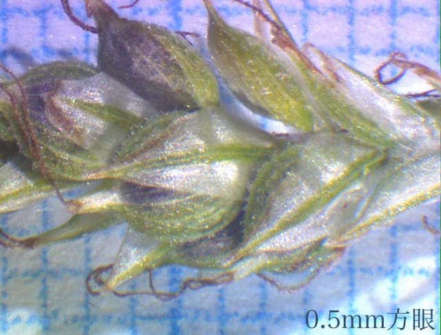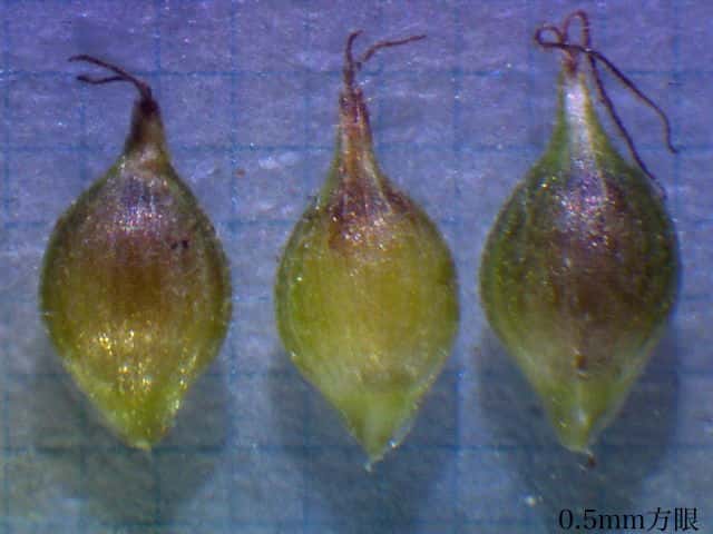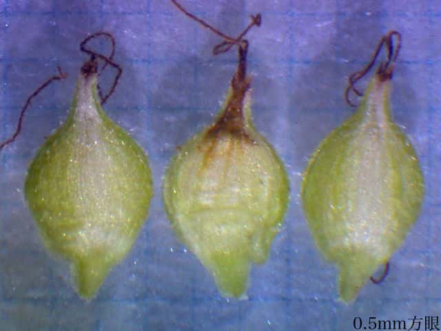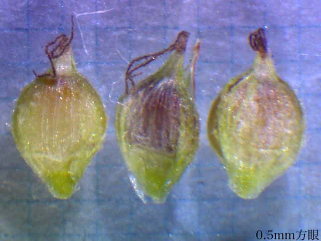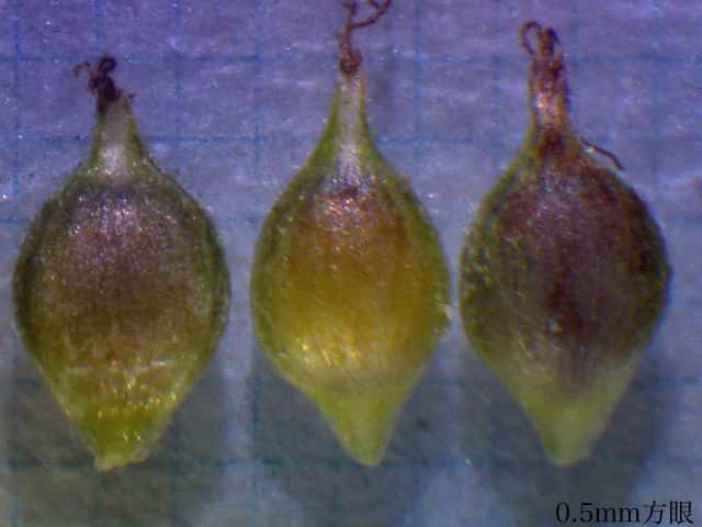 | ▼果胞は長さ約2.4mm、鱗片は1.7mm。 | ▼果胞は長さ約2.3mm、毛が密生する。 | ▼果実は長さ約1.5mm。 |