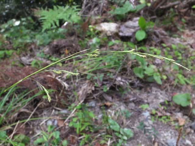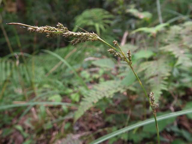| 常緑多年草。 関東南部以西〜九州の平地から低山地の疎林内や草地に生える。根茎は短く密に叢生する。基部の鞘は葉身があり、濃褐色で後に繊維に分解する。葉は硬く幅2〜4mm、ふつうナキリスゲより明るい色をしている。有花茎はは高さ40〜80cm。苞は有鞘、上方のものは刺状、下方のものは長い葉身がある。小穂は1節に2〜5個をつけ、下部のものはときに枝分かれし、長さ1〜2.5cm、幅2〜2.5mm、すべて雄雌性。雌鱗片は果胞の肩の高さまであり、ほぼ果胞全体を隠すことが多い。果胞はやや小さく、長さ2.5〜3mm、基部の柄は短く0.5mm以下、嘴も短く、長さ0.5〜1mm、細脈が多数あり、寝た短毛がある。柱頭は2岐。果期は9〜11月。(日本のスゲ) 学名は、Carex brunnea カヤツリグサ科スゲ属ナキリスゲ節 よく似たナキリスゲは果胞が長さ2.8〜3.5mm、匍匐枝はなく大株となる。センダイスゲは長い匍匐根茎があり疎らに生え、果胞は長さ3〜3.5mm。 |