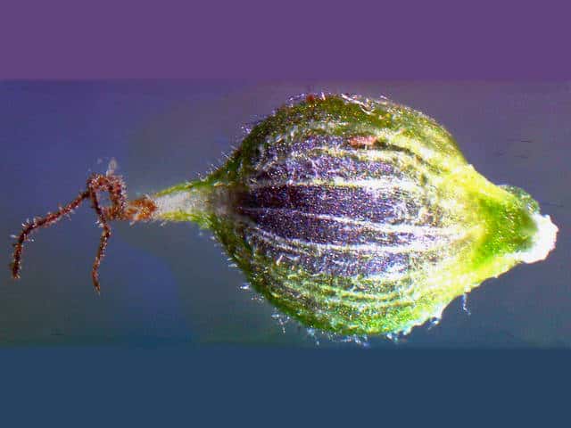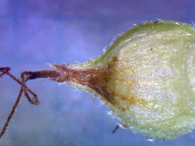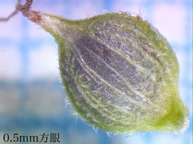 | ▼果胞は長さ2.3〜2.5mm。 | ▼果胞には伏毛があり、口部は2歯。 | |