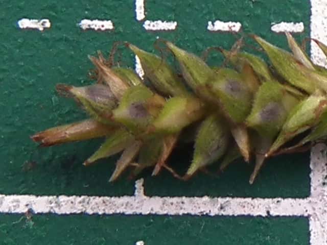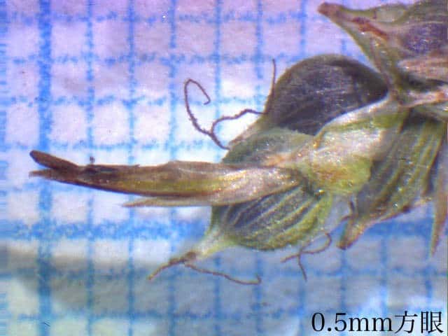 | ▼柱頭は2岐し、鱗片は果胞の肩くらい。 | ▼鱗片は長さ約2mm。 | |