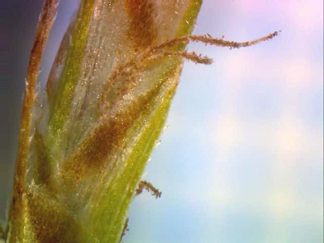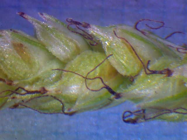 | ▼小穂は雄雌性、先端の雄花部は短い。 | v小穂の先端部に雄花がつく。 | ▼先端部の雄花。 |
