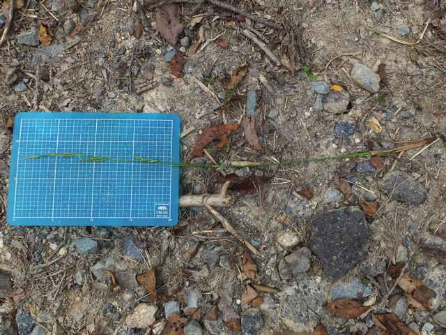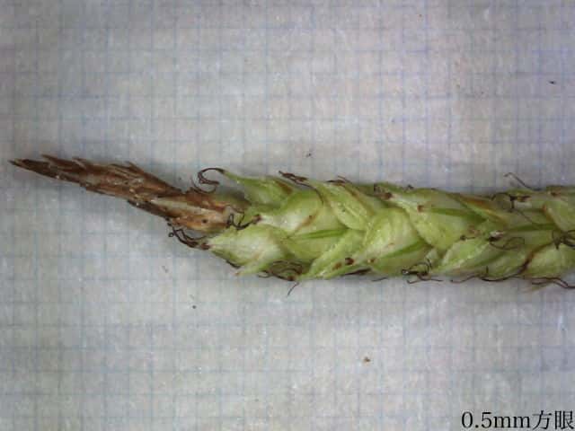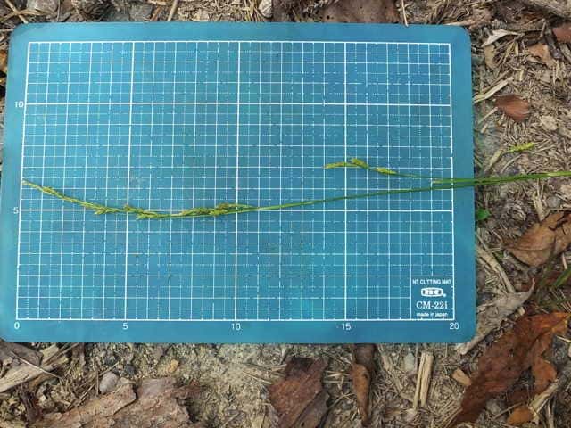 | ▼小穂は長さ約2cm、幅約2mm。 | ▼小穂の頂部は雄性で長さ約5mm。 | |