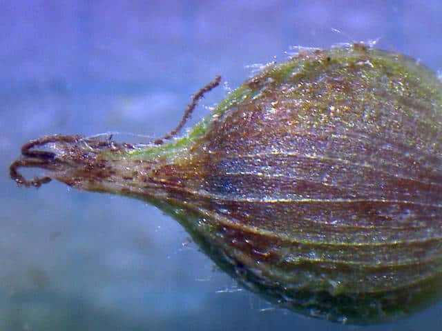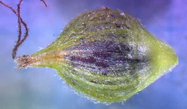 | ▼果胞の口部は2歯、伏毛が多い。 | ▼果実は広卵形、長さ約1.5mm。 | |