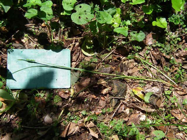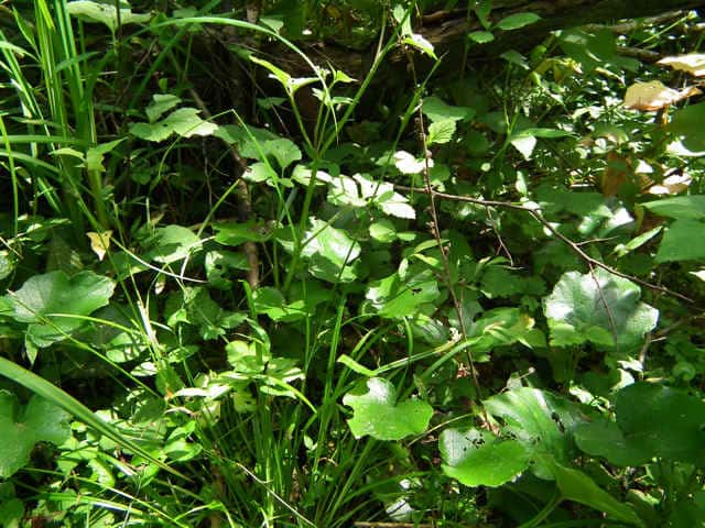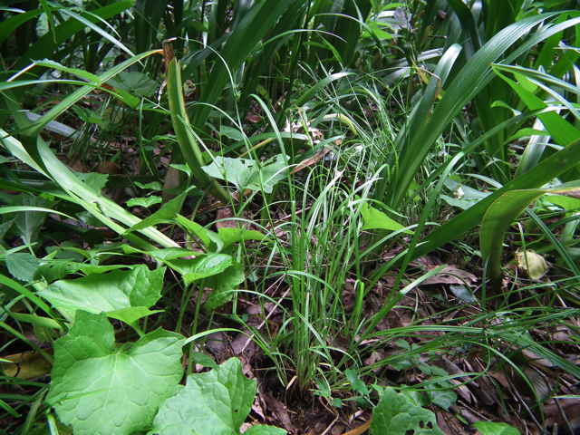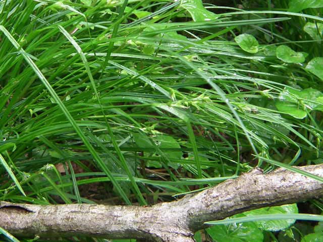 多年草 北海道〜本州の平地から山地の湿った樹林内、湿地、水田畦などに生える。根茎は短く叢生する。基部の鞘は淡色。葉は粉緑色で幅2〜10mm。有花茎は高さ10〜40cm。小穂はたがいに離れてつき、頂小穂は雄性、緑白色、ほとんど柄はなく、長さ5〜12mm。側小穂1〜3個は雌性、長さ1〜1.5cm、まばらに数個の果胞をつけ、ふつう柄は直立または斜上している。苞は葉身があり、有鞘。雌鱗片は白膜質で中肋は緑色、鋭頭、果胞のほぼ半長。果胞は長さ5〜6mm、まれに8mm、有脈で無毛。柱頭は3岐。果期は5〜6月。(日本のスゲ) 学名は、Carex parciflora var. macroglossa カヤツリグサ科スゲ属タマツリスゲ節 |