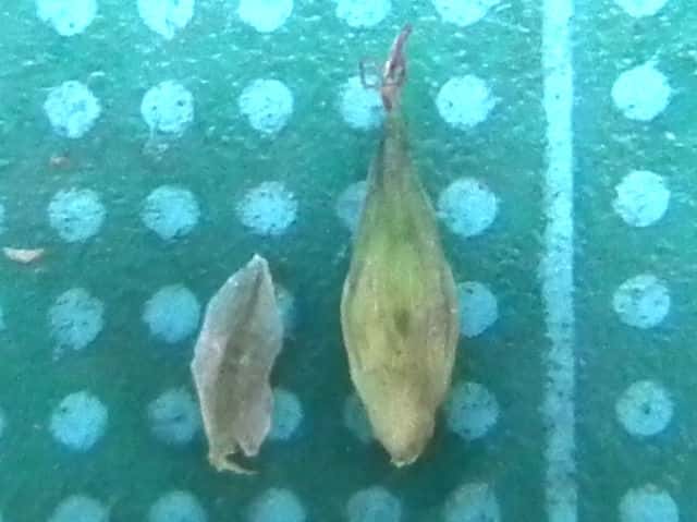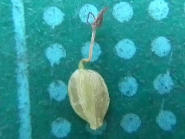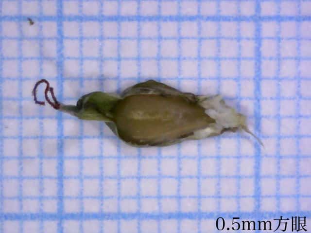 | ▼雌鱗片に長い芒のあるもの。長さ約5.5mm。 | ▼芒のない雌鱗片、長さ約3.5mmm。 | ▼果胞内部で花柱が湾曲する。 |
