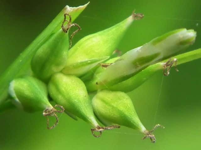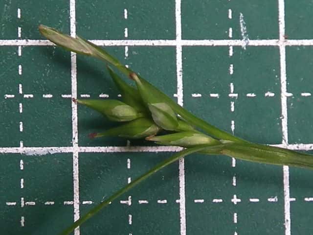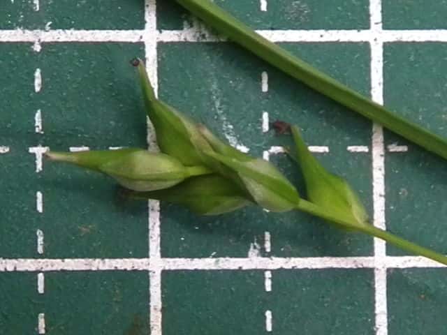 | ▼雌小穂は長さ約1.5cm。 | ▼果胞は長さ約6mm。 | ▼柱頭は3岐する。 |