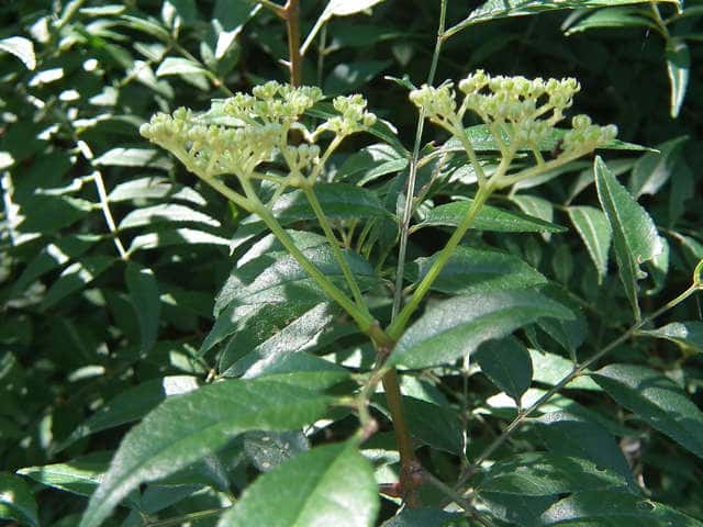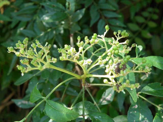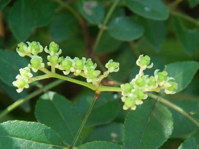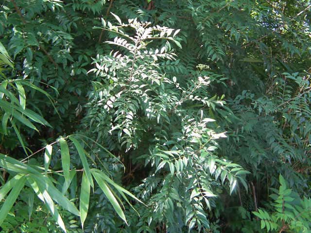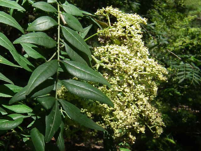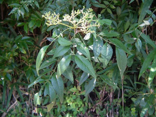 | 落葉小高木 東海地方以西〜九州の林縁などの荒れ地に生える。カラスザンショウとイヌザンショウの中間の形で、両者の雑種と考えられている。高さ4〜6m。若枝は無毛。枝には下部が太くて平たい、長さ5〜8mmのとげがある。葉は互生し、長さ10〜20cm、11〜23枚の小葉からなる。小葉は披針形、長さ3〜6cm、幅1〜1.5cm、先は細くとがって先端は浅く2裂し、基部はややゆがんだ鈍形、縁には細かな鋸歯があり、両面無毛、裏面はやや白みをおび油点がある。枝先に散房花序を伸ばし多くの花をつける。雌雄異株。萼は皿形で5裂し、裂片は広卵円形で長さ約0.5mm。花弁は白色、卵状長楕円形で長さ約2mm。果実は3個の分果に分かれ、分果は扁球形で長さ約5mm。種子は楕円状球形で長さ約4mm、黒色でつやがある。花期は8月。(日本の野生植物) 学名は、Zanthoxylum fauriei ミカン科サンショウ属 イヌザンショウの葉は長さ5〜15cm、小葉は長さ1〜4cmとされる。 検索表(日本の野生植物) C D 小葉は披針形または披針形状長楕円形。長さ4〜15cm、幅1.5〜4cm。刺は長さ2〜5mm。 ・・・・・・ カラスザンショウ D 小葉は披針形、長さ3〜6cm。幅1〜1.5cm。刺は長さ5〜8mm。 ・・・・・・ コカラスザンショウ C 小葉は長さ1〜4cm、幅0.5〜1.3cm、刺は長さ4〜10mm。 ・・・・・・ イヌザンショウ |