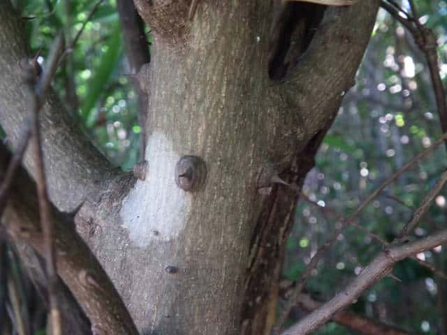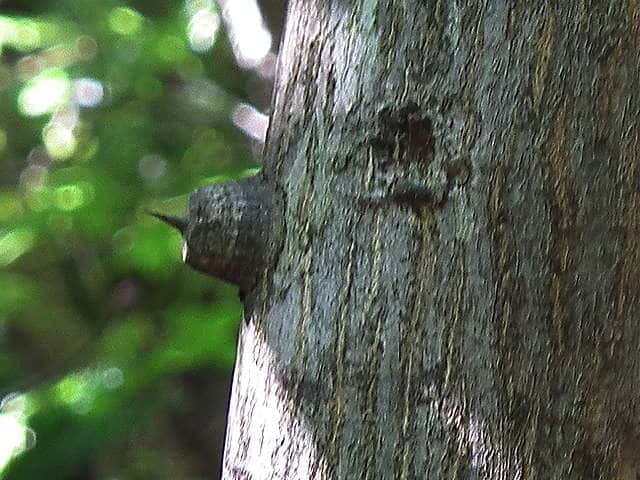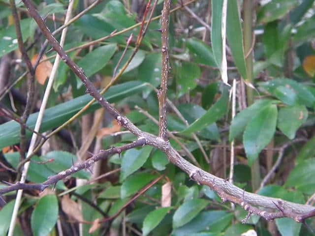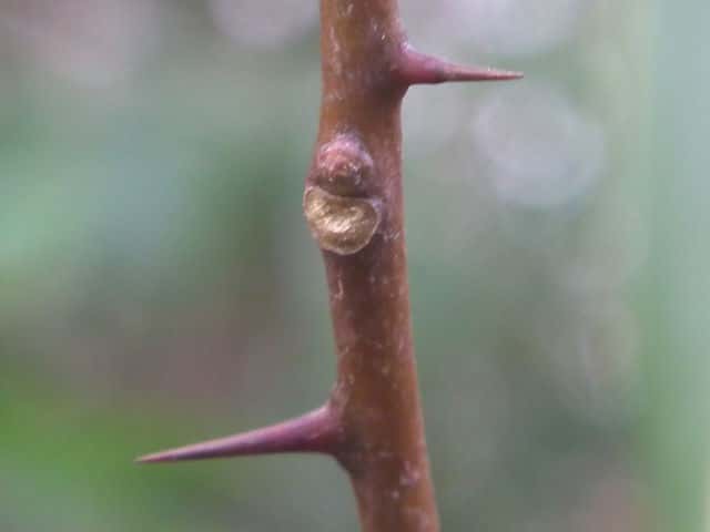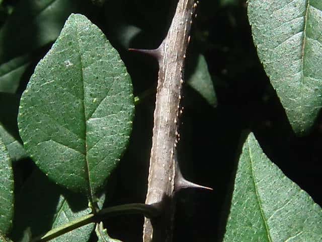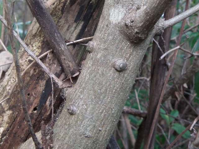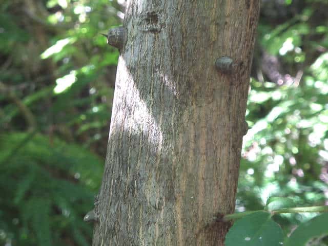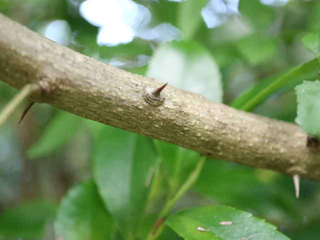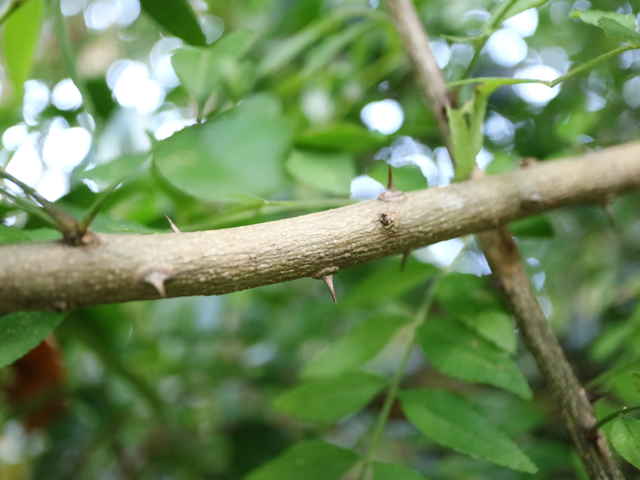 | ▼小葉は小葉柄を含めて長さ約7cm。 | ▼枝につく刺。 | |