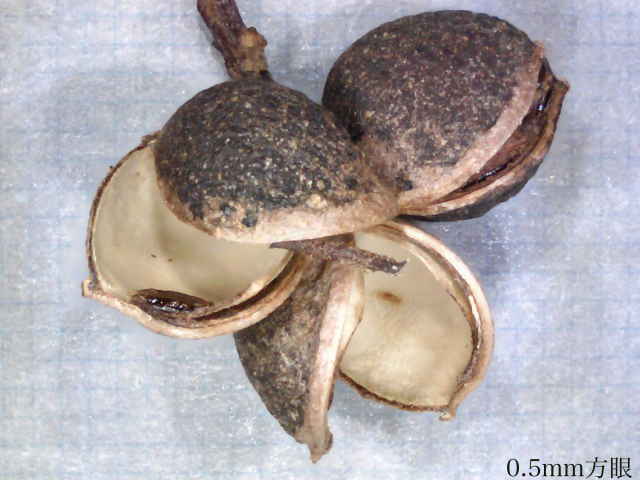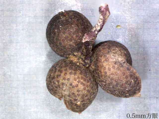 | ▼果実は長さ約5mm。 | ▼果皮の拡大。 | |