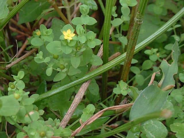 1年草 北海道〜九州の休耕田や湿地に生える。茎は細く、高さ3〜10cmでよく分枝する。葉は対生し、黄緑色の広卵形、長さ2〜7mm、多数の明点がある。花は枝先につき、花弁は5個で長さ2.5mm。雄しべが5〜8個。苞葉は卵形で丸い。秋に紅葉する。葉のつけ根に肉芽ができ、株が枯れても肉芽から新苗となる。花期は7〜8月。 学名は、Hypericum laxum オトギリソウ科オトギリソウ属 よく似たヒメオトギリは、雄しべが10〜20個。 |