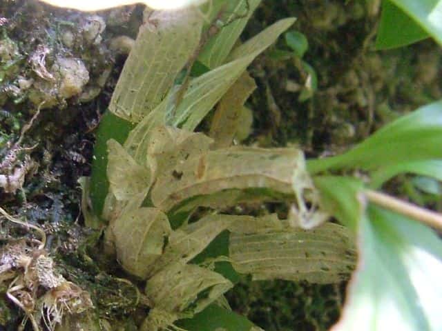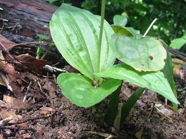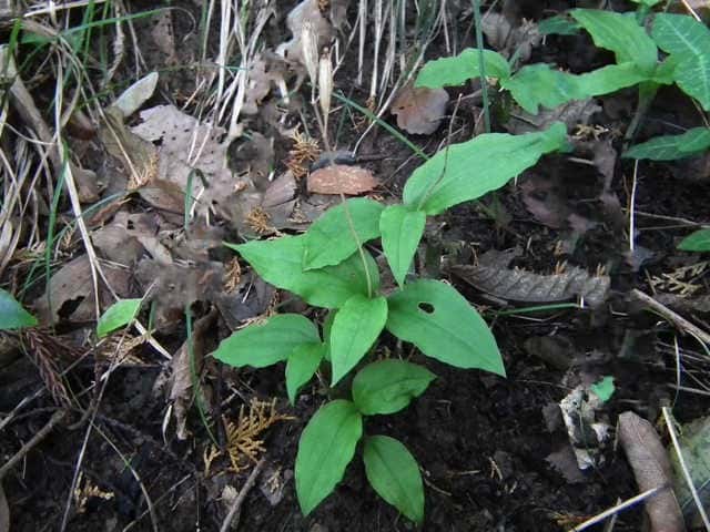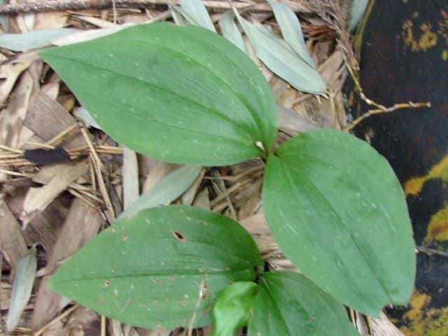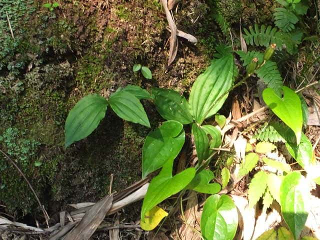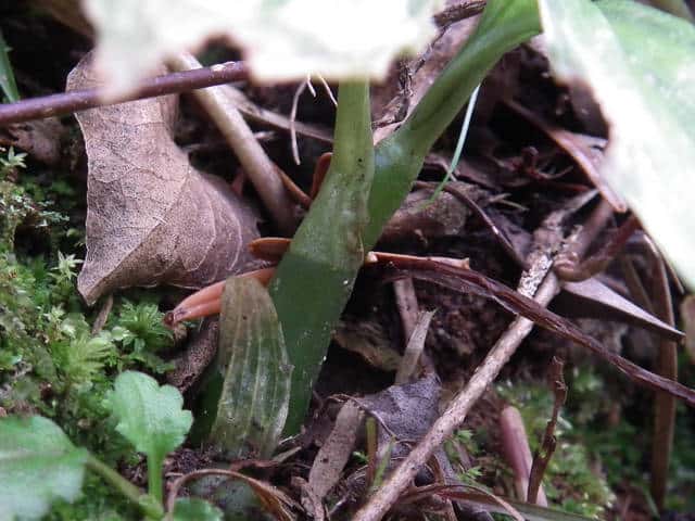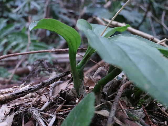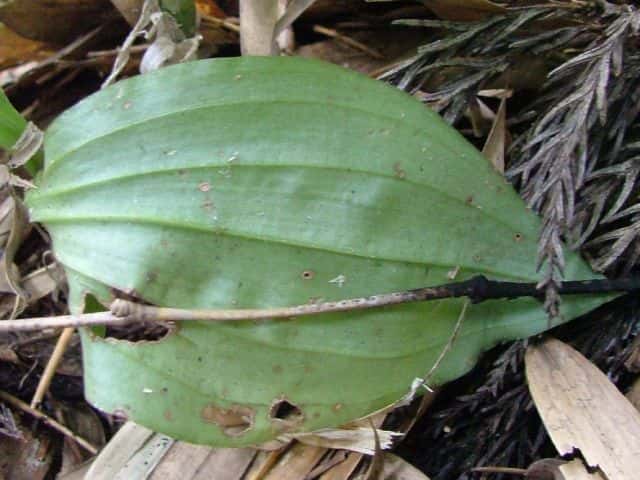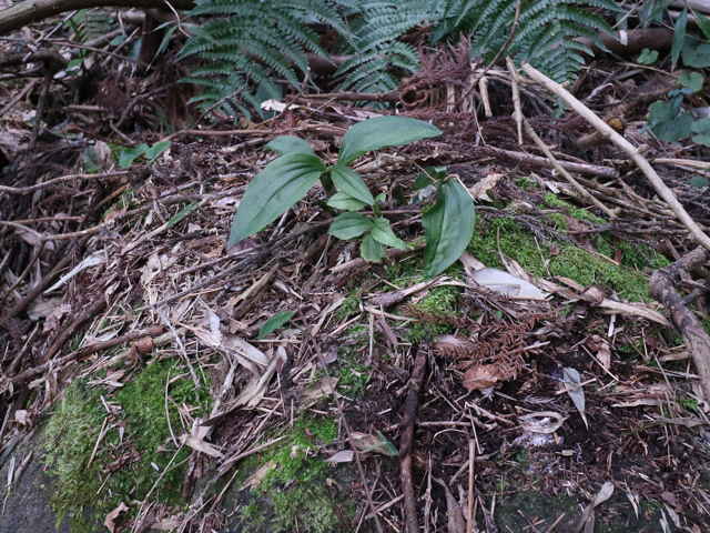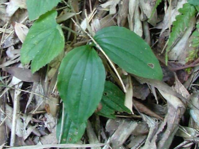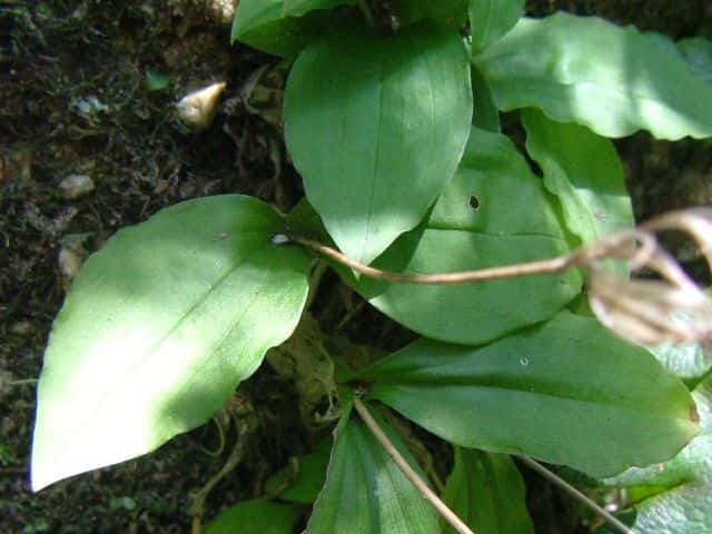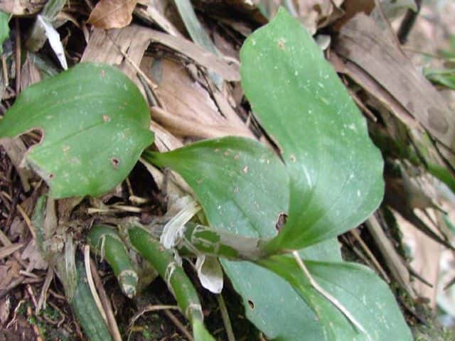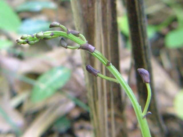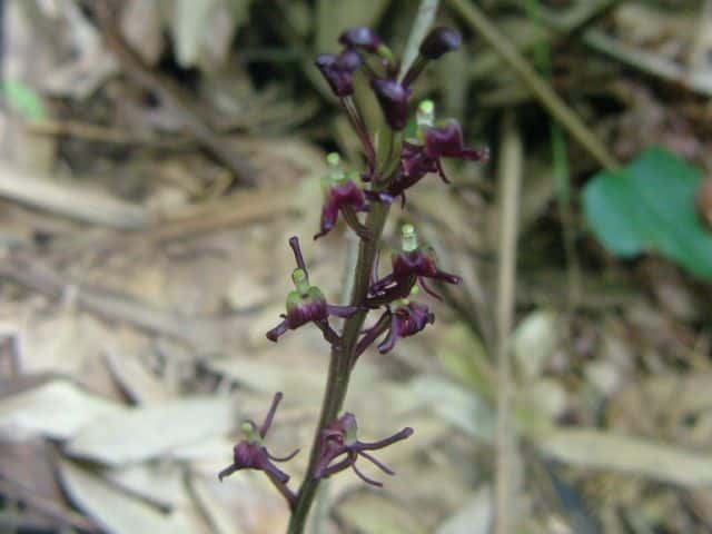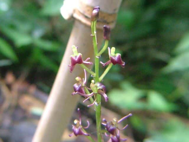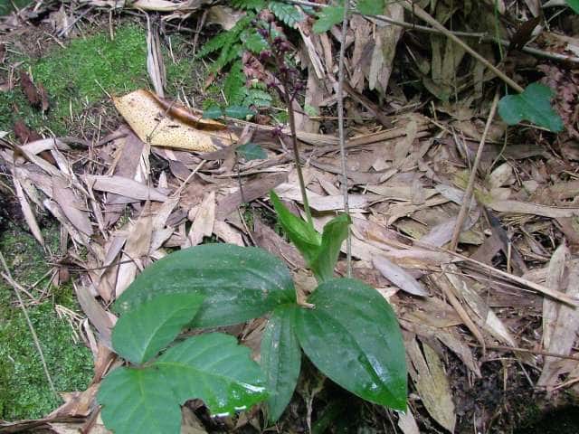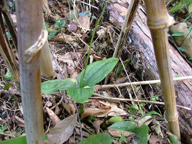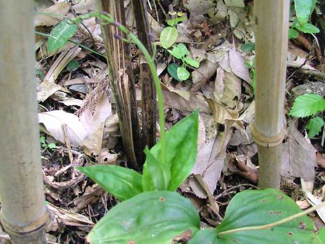 | 多年草 茨城県以南〜九州の常緑樹林内に生える。偽球茎は多肉質。葉は広楕円形で先はとがり、長さ5〜12cm。花茎は高さ15〜30cm、暗紫色の花を5〜10個総状につける。萼片は披針形で長さ約1cm。側花弁は線形。唇弁は倒卵形で長さ約1cm、反曲し、先端はへこむ。基部に2個の針状突起がある。花期は6〜7月。(山に咲く花) 学名は、Liparis nervosa ラン科クモキリソウ属 |