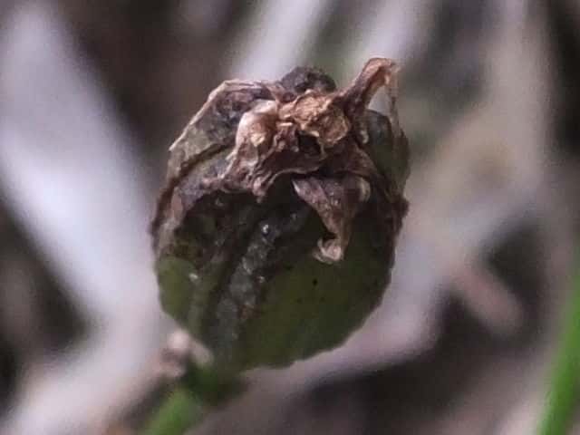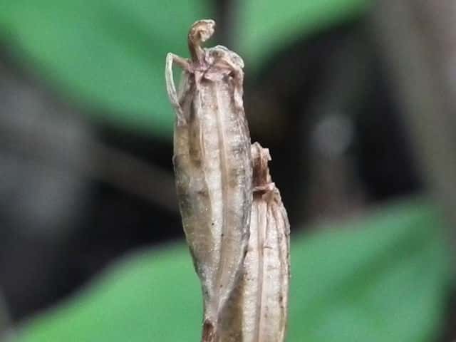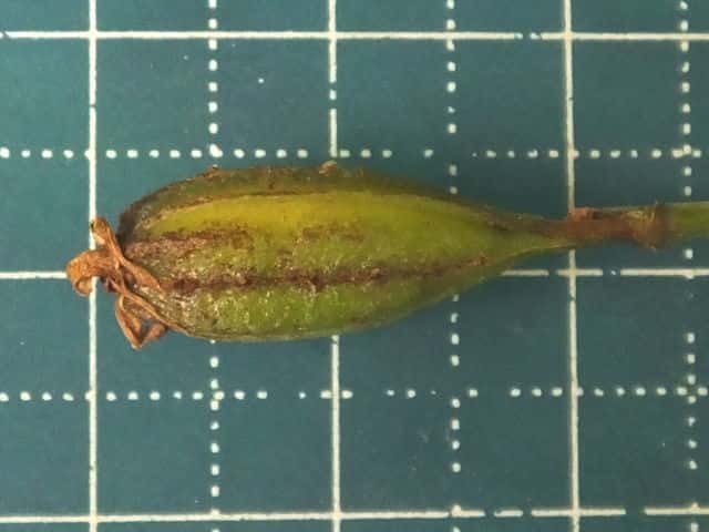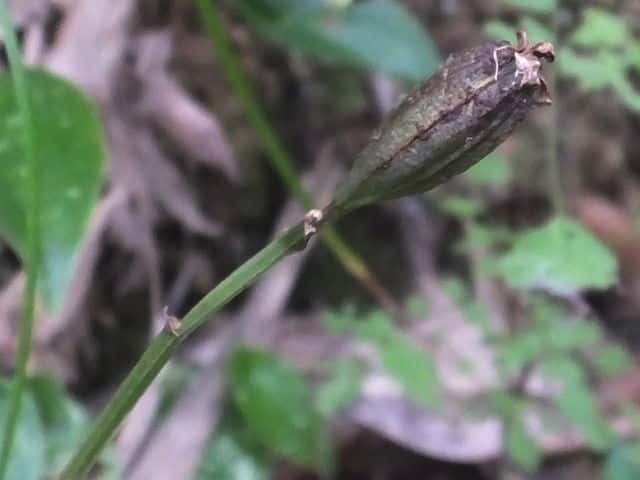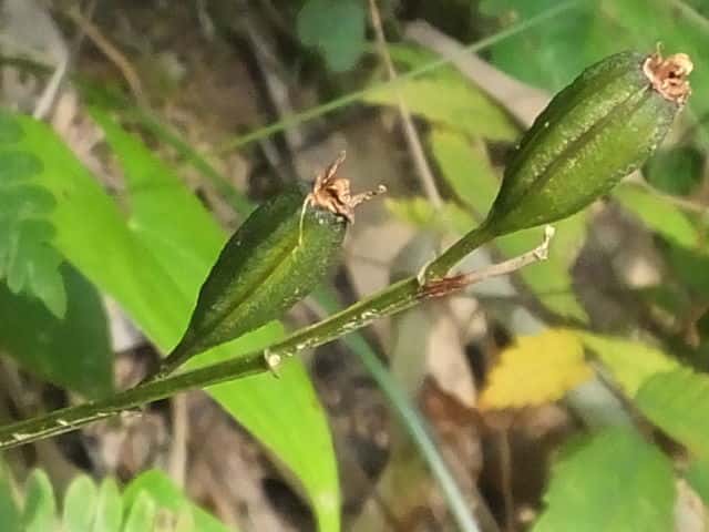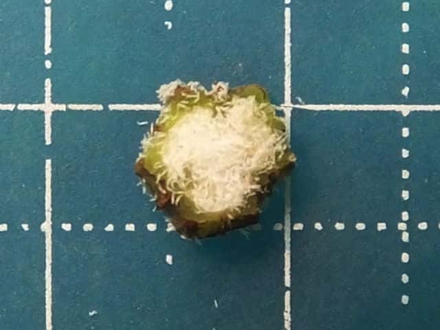 | ▼果実は長さ約1.5cm。 | ▼果実の横断面、稜があり中に微細な種子が詰まっている。 | |