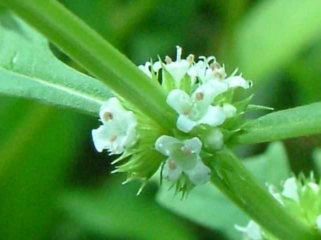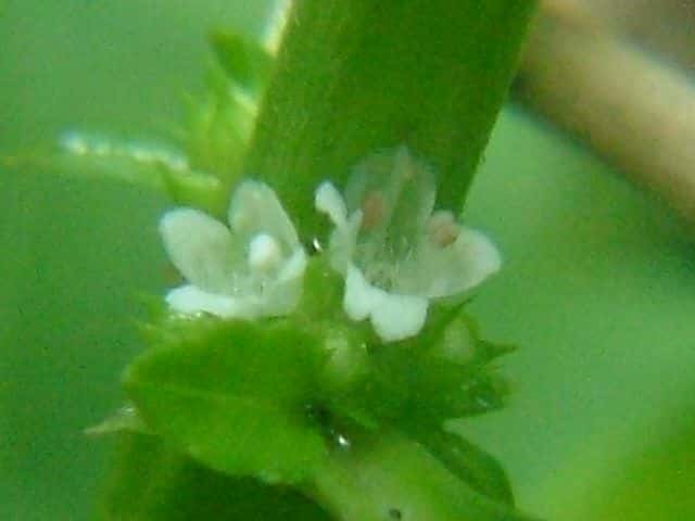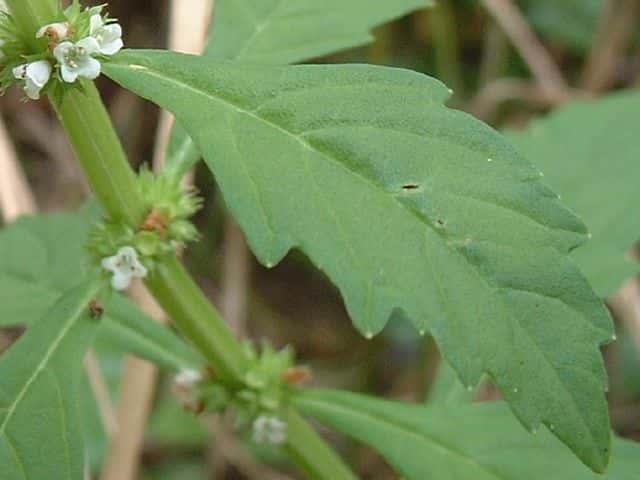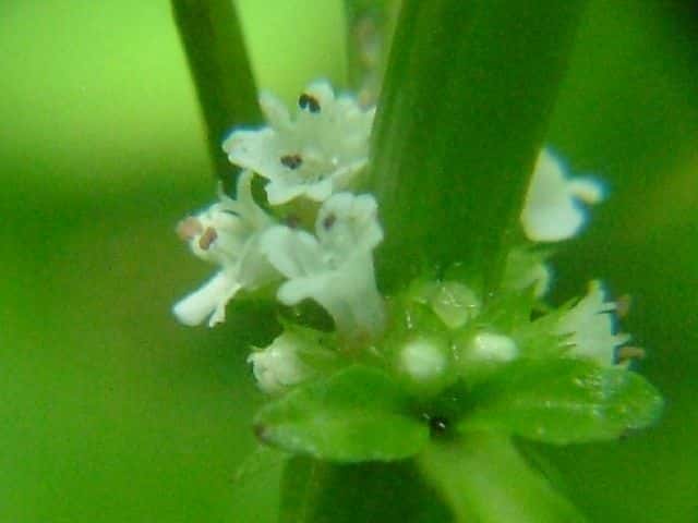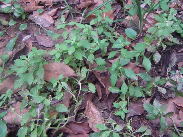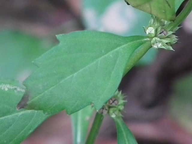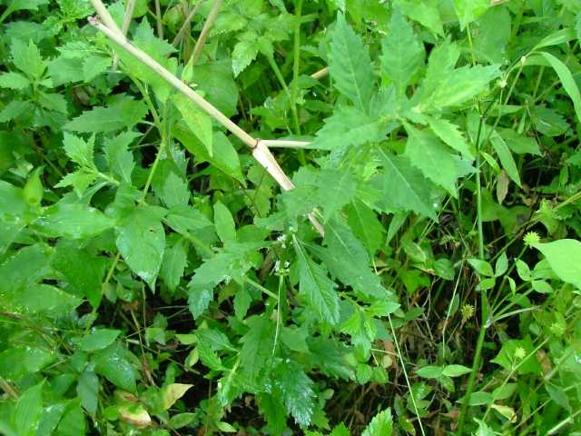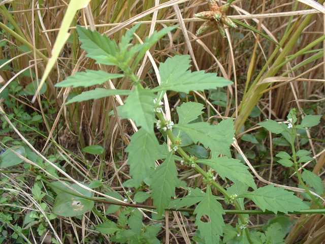 | 多年草 北海道〜九州の湿地に生える。地下茎は横走し、多くの匐枝状の地下茎を伸ばす。茎は高さ10〜60cmになって細かい毛があり、ふつう下部で分枝し、基部から葉を対生する匐枝を伸ばす。葉は菱状狭卵形で長さ3〜6cm、幅1〜2.5cm、鈍頭、縁には粗い鈍鋸歯があり、基部はくさび形で短い葉柄に流れ、光沢はなく、無毛。花は茎の中部以上の葉腋にかたまってつき、小苞は萼よりも短く長さ1〜1.5mm。萼は花時長さ約2mmで、5中裂し、裂片は狭三角形で鋭尖頭。花冠は白色で長さ、径ともに約3mm。分果は長さ約1.2mm、広いくさび形。花期は8〜10月。 茎が直立、分枝しないか少数の短い枝を出す型をコシロネ、茎がさかんに分枝し、枝も茎と同じ高さまで伸びるものをヒメサルダヒコというが、生態型にすぎないと思われる。前者が北地や乾燥気味の場所に多い傾向がある。(日本の野生植物) 学名は、Lycopus cavaleriei シソ科シロネ属 よく似たエゾシロネは萼の裂片の先が三角状になるのみで尖らない。また、ヒメシロネは葉が細く、鋭い鋸歯がある。 |
