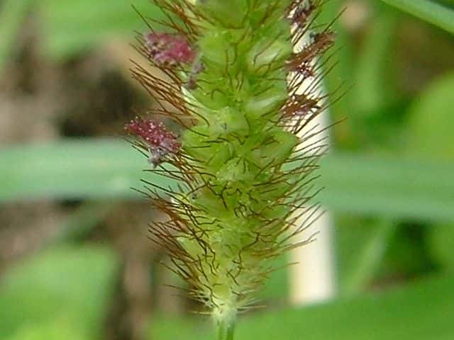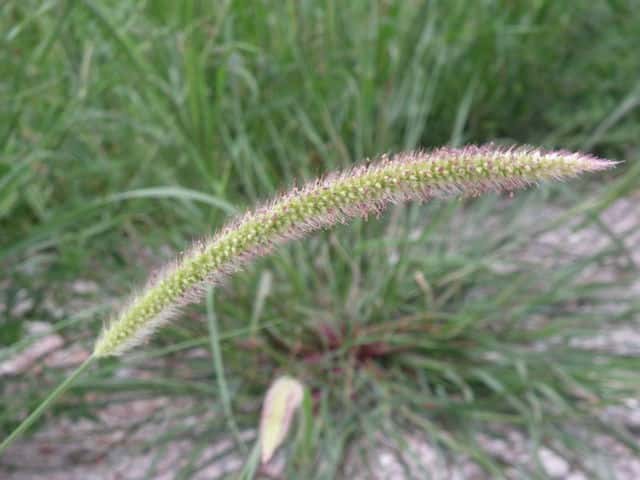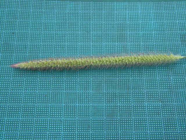 1年草ないし越年草 本州〜沖縄の低地の路傍や草原に生育する。茎は高さ30〜60cm、叢生しやや偏平、平滑・無毛。葉は長さ15〜40cm、幅3〜7mm、基部の縁にだけ長さ5mmほどの白い軟毛がはえ、ややざらつき裏面に少し光沢がある。葉舌は毛状、長さ0.5mm。葉鞘は平滑・無毛。花序は長さ5〜15cm、径8〜12mm、総苞毛(芒)は長さ10mm内外、淡黄褐色または紫褐色、時に黄金色を帯びる。小穂は花軸に密につき卵形、長さ2.2〜2.8mm、穎は無毛。第1包穎は卵形、長さ1mm、第2包穎は広卵形、1.5mm、5脈。退化した第1小花の護穎は卵形、小穂より短い。花期は5〜6月。(日本イネ科植物図譜) 学名は、Setaria pallidefusca イネ科エノコログサ属 よく似た仲間にエノコログサ、アキノエノコログサ、キンエノコロなどがある。 キンエノコロ・・・・・小穂広卵形、長さ2.8〜3mm コツブキンエノコロ・・小穂長楕円形、長さ2〜2.8mm |