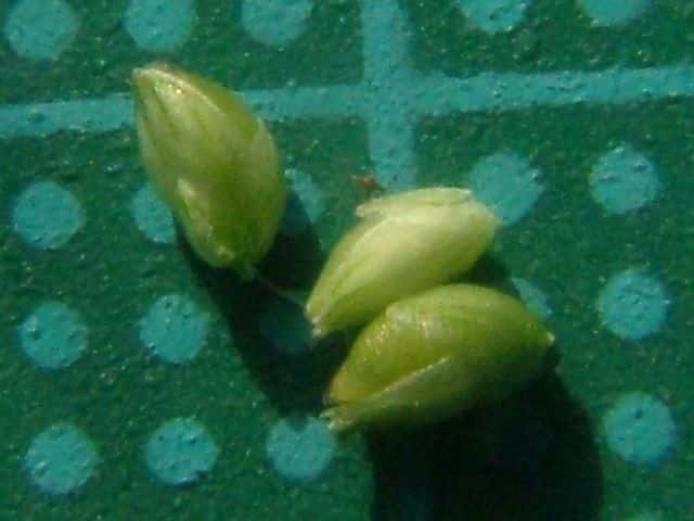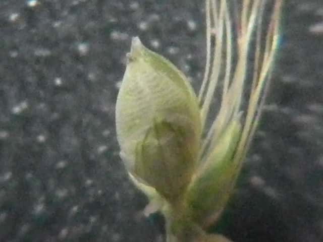 | ▼小穂は長さ約2.5mm。 | ▼横ジワのある護穎が半分ほど露出する。 | ▼標本の画像。 |