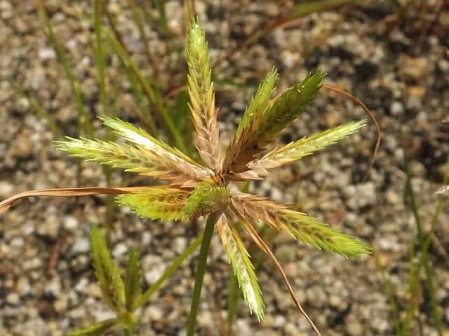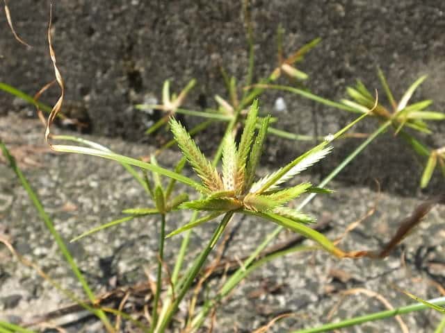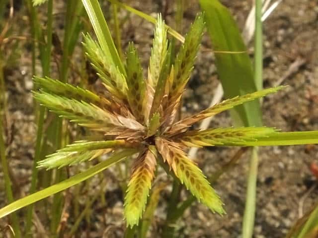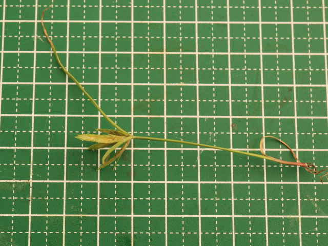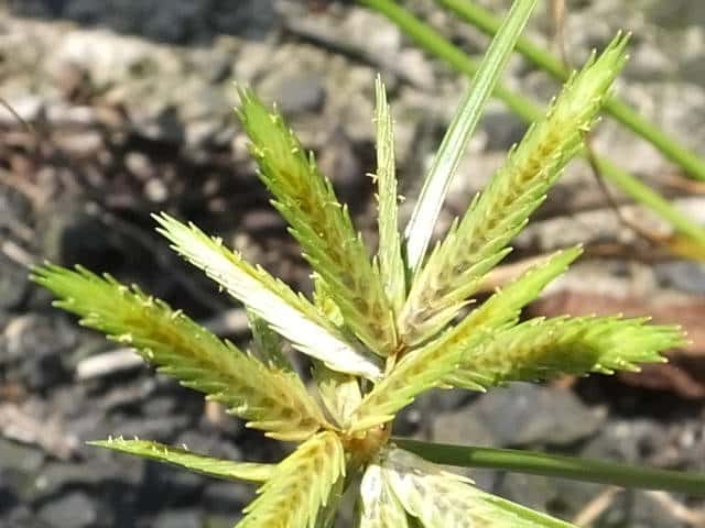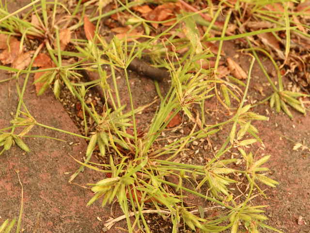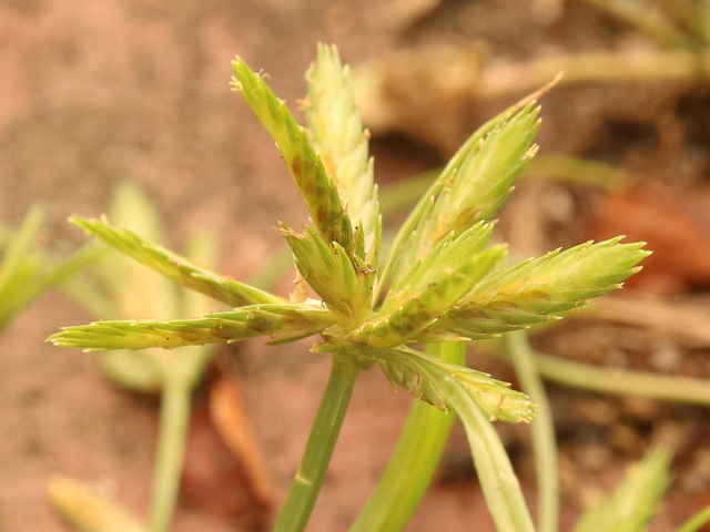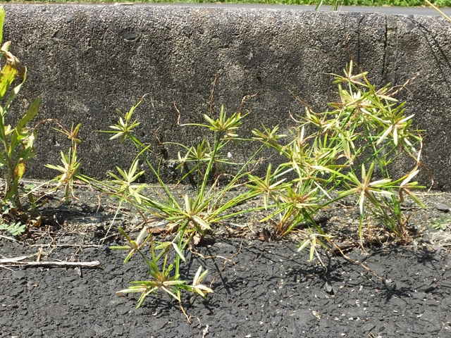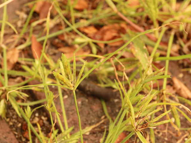 1年草 関東以西〜九州の平地や山地の路傍や草地に生える。稈は高さ10〜30cm。葉は幅1〜3mm、少数で稈より短い。基部の鞘は帯紅褐色。花序は大きくほとんど複生するが、まれに小穂が密集して頭状となることもある。苞葉の葉身は3〜4枚、花序よりも長く、花序枝は数本。小穂は線形、長さ1〜2.5cm、扁平で黄白色を帯び、20〜35個の花がある。鱗片は広卵形、長さ約3.5mm、少し外曲する長芒があり、中肋は緑色で太く、数脈がある。そう果は広倒卵形、長さ約1.2mm、褐色、光沢がある。花柱はそう果の2倍長。柱頭は3個。花期は8〜10月。(岡山県カヤツリグサ科植物図譜) 学名は、Cyperus compressus カヤツリグサ科カヤツリグサ属 |