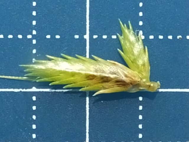 | ▼小穂は長さ12〜14mm。 | ▼鱗片は長さ3.5mm、先は1mmの芒となる。 | |