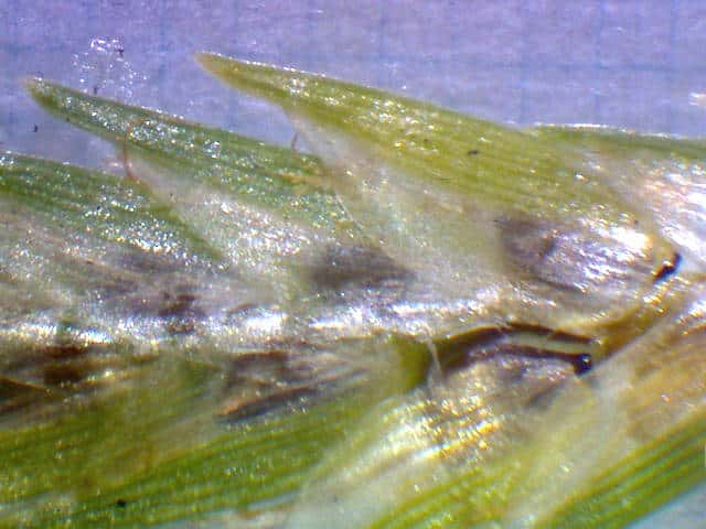| ▼鱗片の先は長さ約0.7mmの芒となる。 | ▼中肋は緑色で、数脈がある。 | |