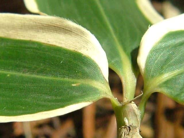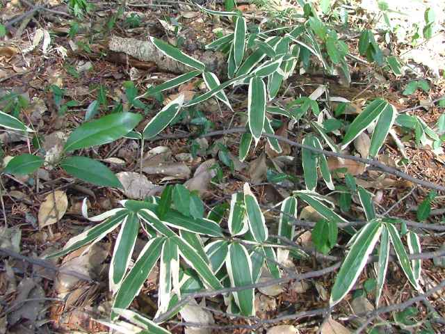 | 常緑竹 京都府に自生地があるといわれるが、原産地は不明。全国で栽培され、逸出して野生状態のものもある。稈は高さ1〜1.5m、直径5〜8mmになる。節はややふくれる。枝は稈の下部から上部にかけてまばらに分岐する。1節に1個でる。稈鞘はふつう節間の2分の1〜3分の2。長い開出毛が密生する。葉身は長さ20〜25cm、幅4〜5cm。革状紙質で、両面とも無毛。葉鞘は無毛。ふつう葉耳があり、肩毛はざらつき、放射状に開出する。葉舌は低い山形または切形。冬期に葉の縁が白く隈どられる。(樹に咲く花) 学名は、Sasa veitchii イネ科ササ属 |