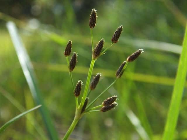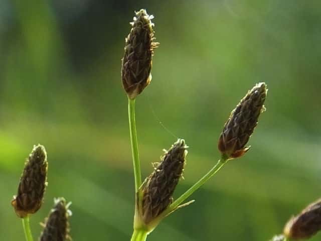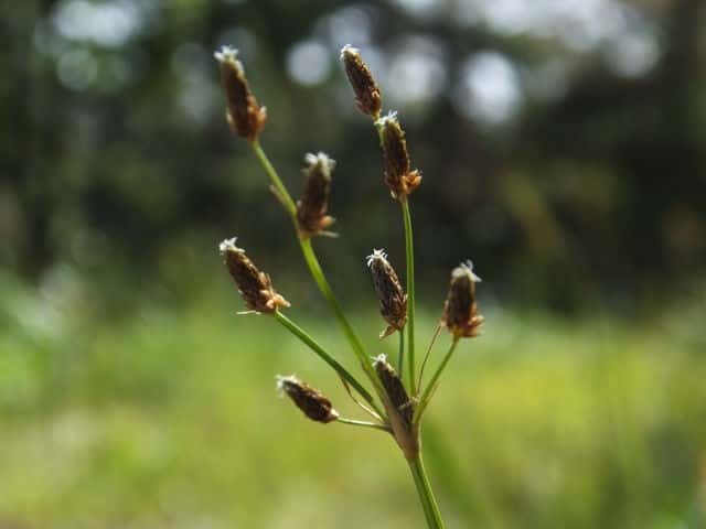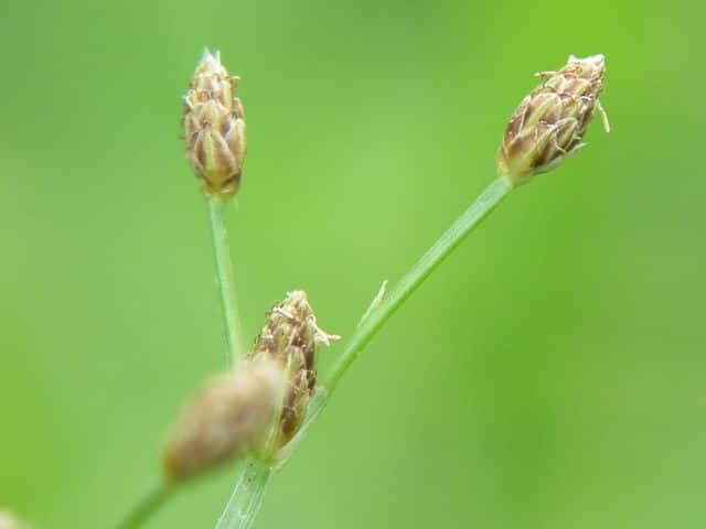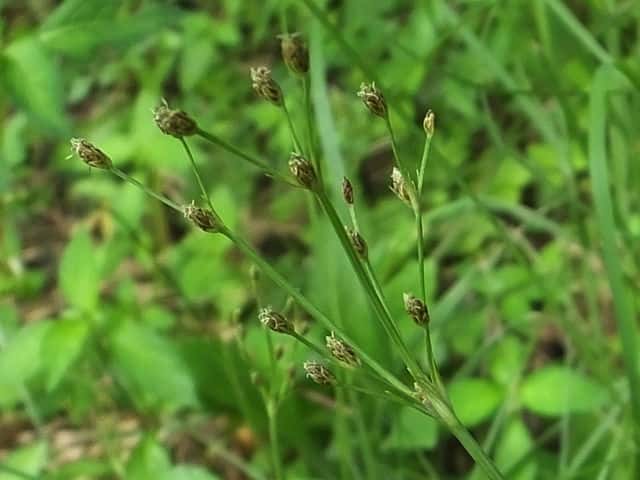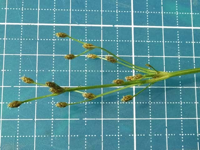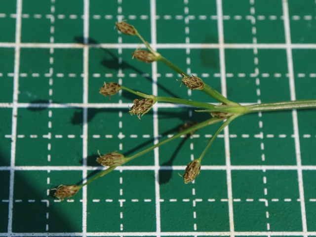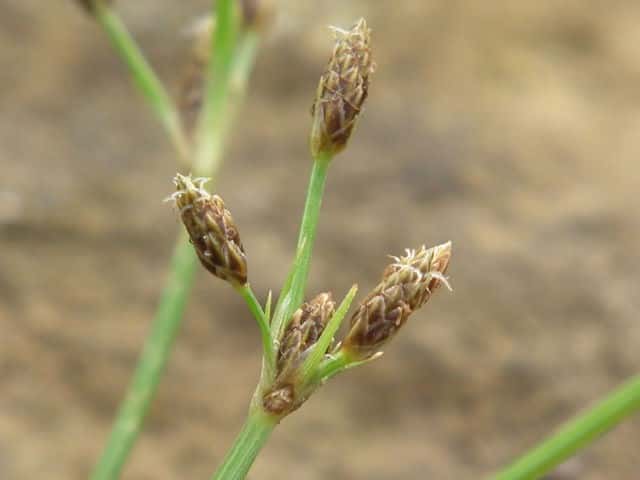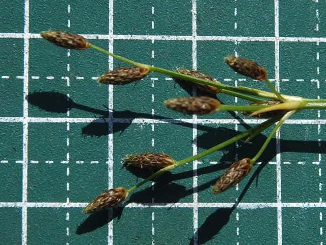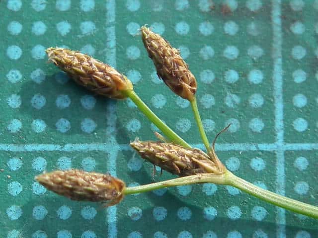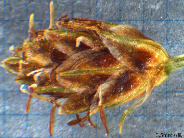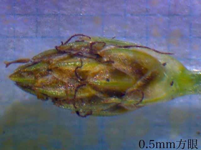 | ▼鱗片の中肋は緑色、縁は褐色。 | ▼小穂は長さ約5mm。 | ▼果実は長さ約0.8mm、柱頭は2岐。 |