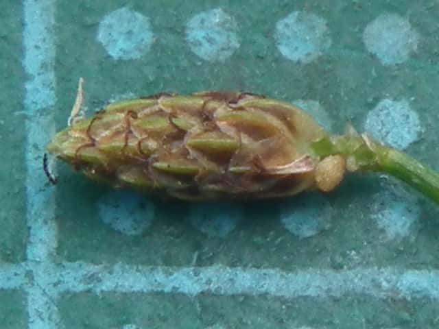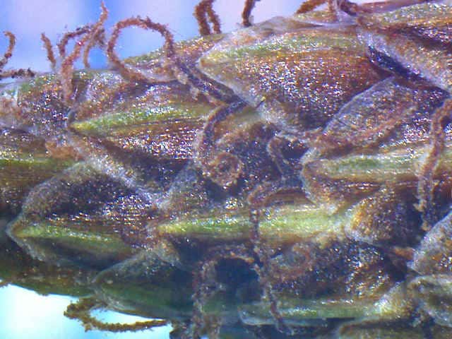 | ▼鱗片は鈍頭、中肋の先が凸点となる。 | ▼鱗片は長さ約2mm。 | ▼柱頭は2岐、果実は長さ約0.7mm。 |