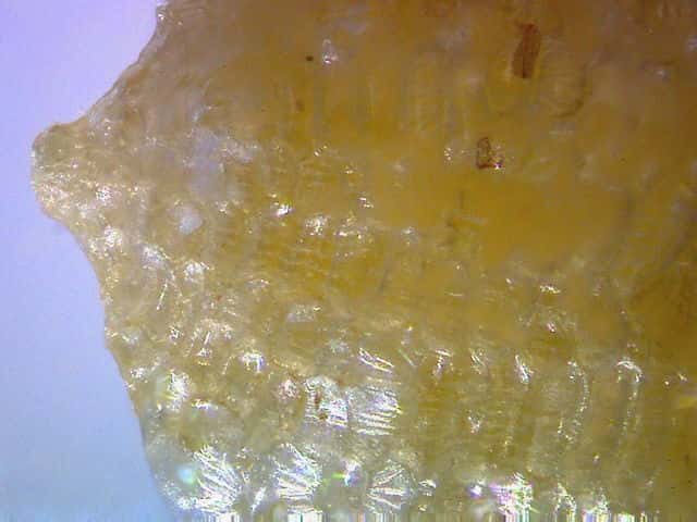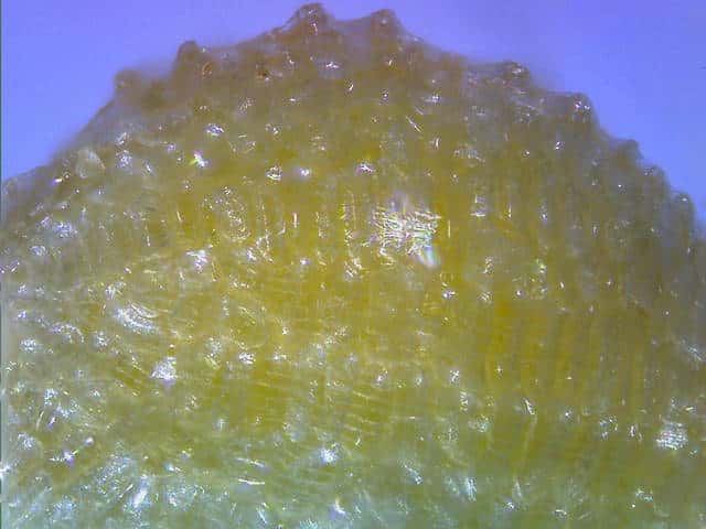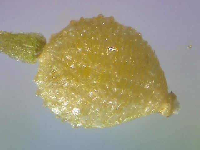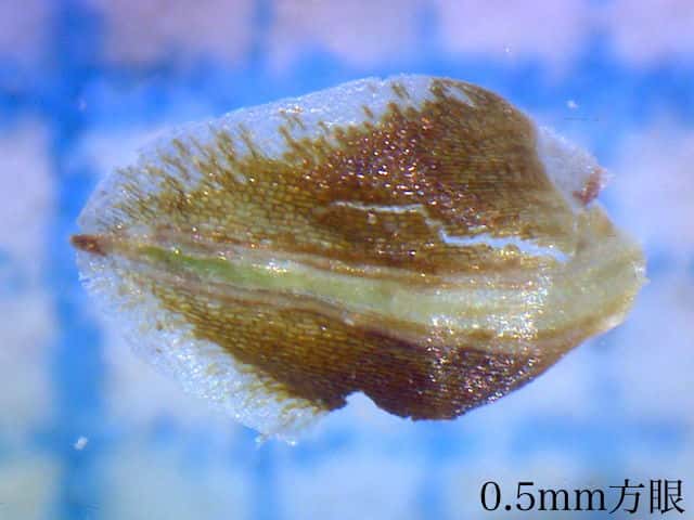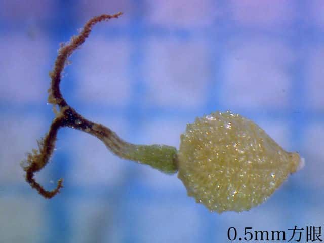 | ▼鱗片は長さ約2mm。 | ▼柱頭は2岐、果実は長さ約0.7mm。 | ▼表面には格子状の模様がある。 |
