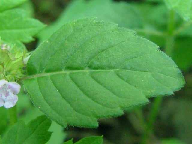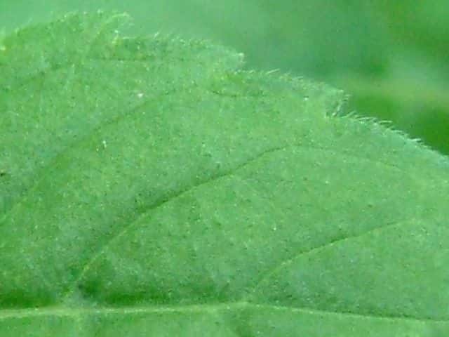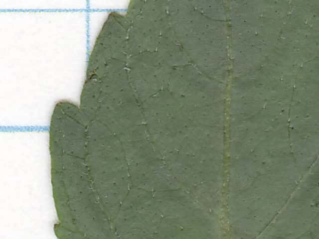| ▼脈上に毛がある。 | v葉の縁に毛が多い。 | ▼葉裏には腺点が散生する。 |