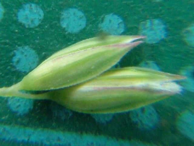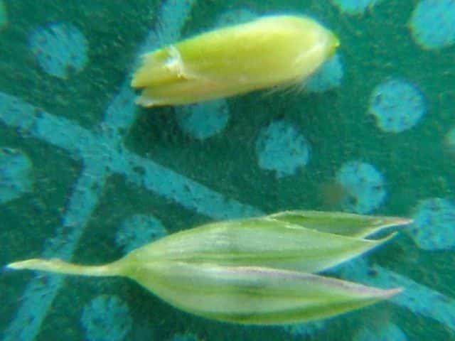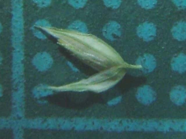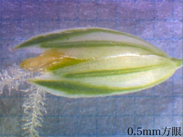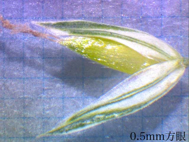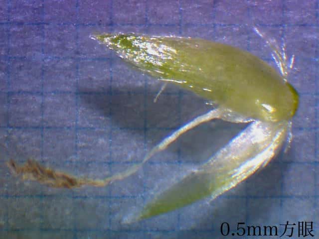 | ▼苞穎に3脈があり背は竜骨となる。 | ▼苞穎は同形で、長さ約4mm。 | ▼苞穎の中に小花がある。 |