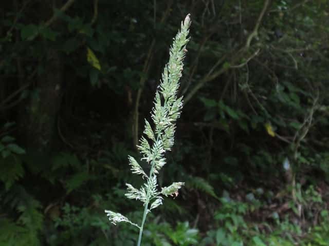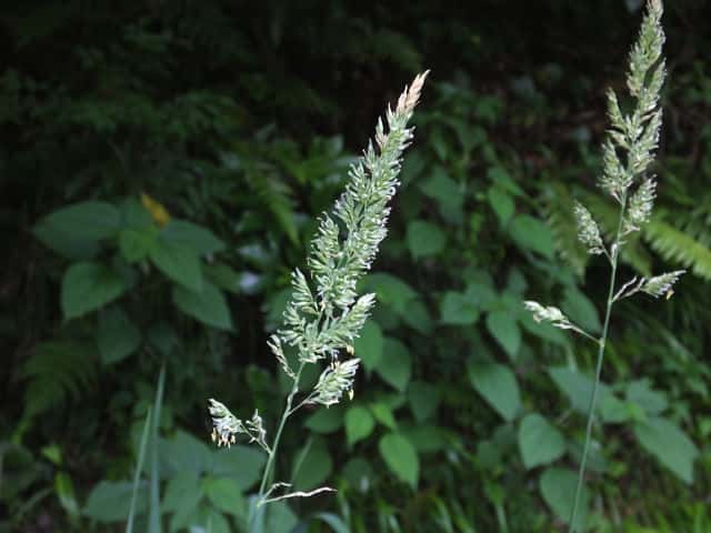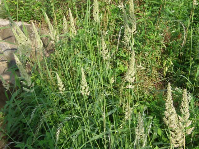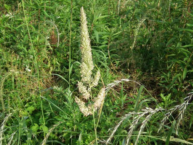 多年草 北海道〜九州の原野や路傍の水辺、水田付近の湿地・休耕水田などに生育し、群生する。茎は高さ70〜180cm、直立・叢生し、匍匐茎を出す。全体無毛。葉は長さ20〜25cm、幅8〜25mm、広線形。葉舌は白色で薄く切形、長さ3〜5mm。葉鞘は平滑。花序は複総状で直立し、小穂は密集し、淡紫褐色をおび光沢はなく、長さ5〜10cm。小穂は卵形で長さ4〜5mm。苞穎は広披針形で同形。第1〜第2小花は、極端に退化。第3小花は長さ3〜3.5mmで護穎に短い毛がある。果実は鋭頭、腹部は突形、暗灰褐色、先端は黒色、光沢なく長さ1.6〜2mm。花期は6〜7月。(日本イネ科植物図譜) 学名は、Phalaris arundinacea イネ科クサヨシ属 |