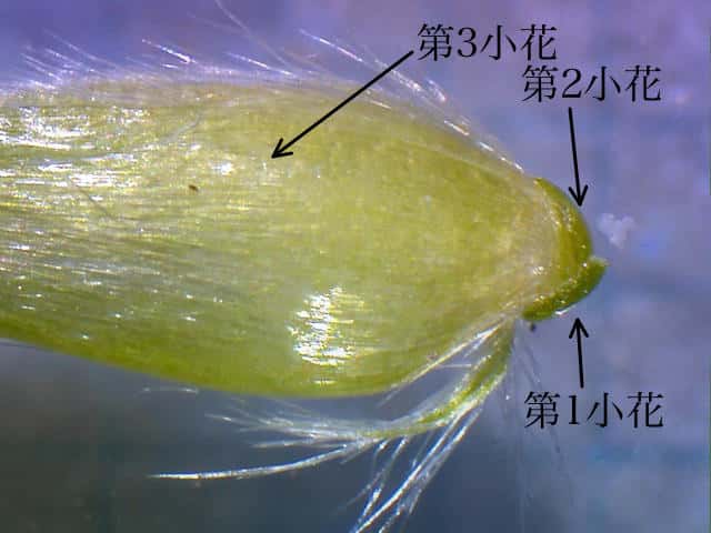 | ▼第1、第2小花は退化し第3小花だけがある。 | ▼護穎には伏毛がある。 | ▼第3小花の基部に退化した小花がある。 |