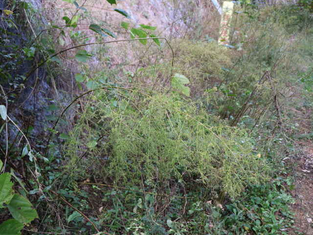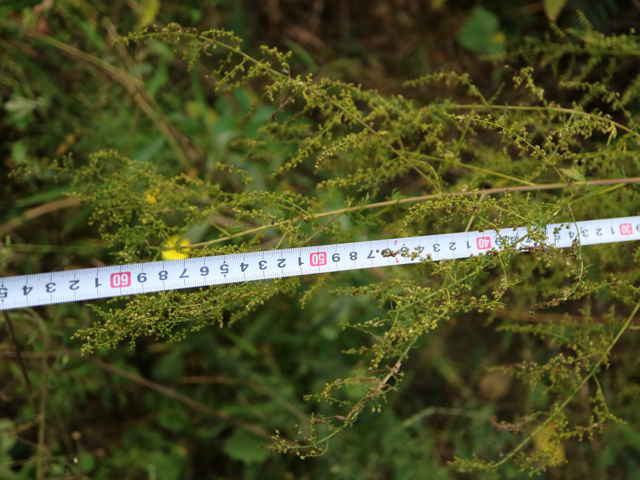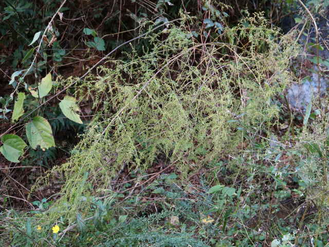 | 一年草 中国から薬用として入り、野生化したものと考えられている。道端や市街の荒れ地などに生える。全体に臭気がある。茎は高さ1.5mに達し、多く枝を出し、毛はない。葉は3回羽状に細かく全裂し、終裂片は幅約0.3mm、表面に粉状の細毛がある。大型の円錐花序に多数の頭花をつける。頭花は球形で、径1.5mm内外、毛はない。果実は長さ0.7mm。別名ホソバニンジン。花期は8〜10月。(日本の野生植物) 花は淡黄褐色の筒状花のみで、中央部に両性花、周辺部に雌花が咲く。(デジタル植物写真集) 学名は、Artemisia annua キク科ヨモギ属 |