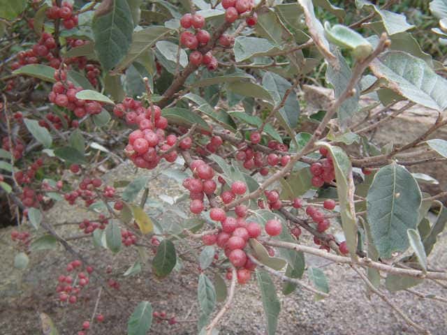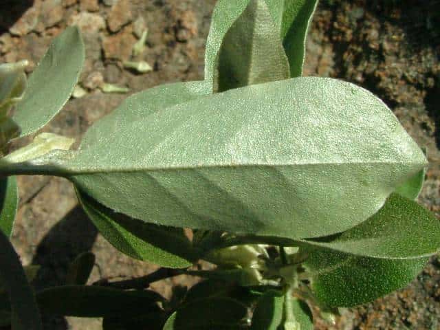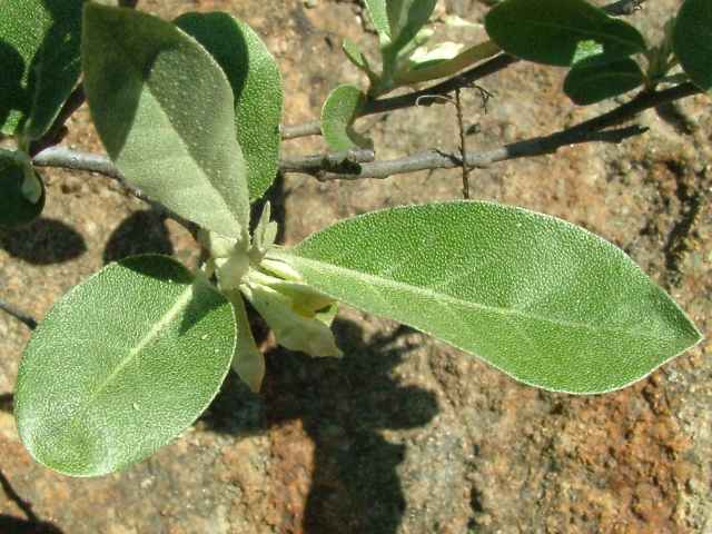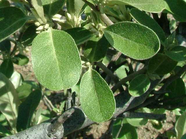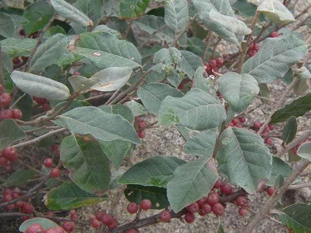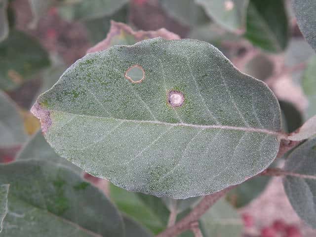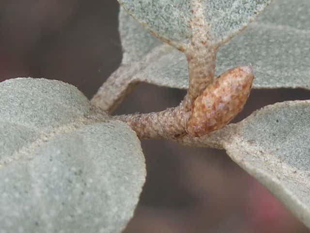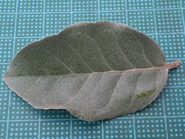 の海岸形。葉は互生。葉身は長さ3〜7cm、幅2〜4cmの卵円形〜広楕円形。アキグミに比べて幅が広く、質は厚い。鱗状毛はアキグミより密生する。花期は4〜5月。(樹に咲く花)