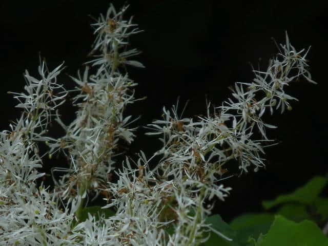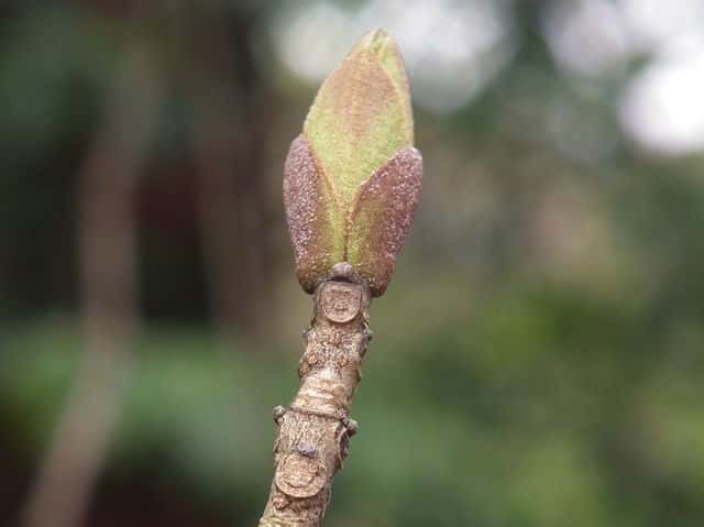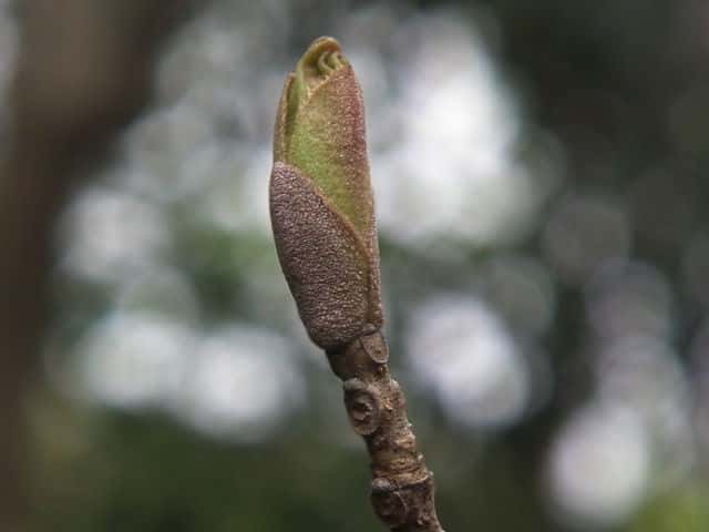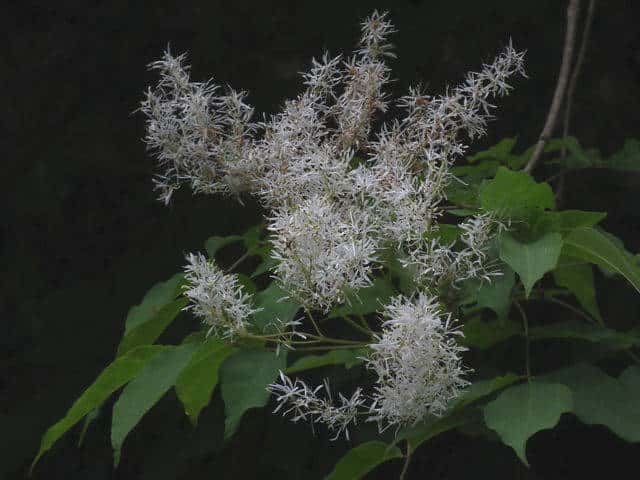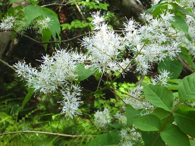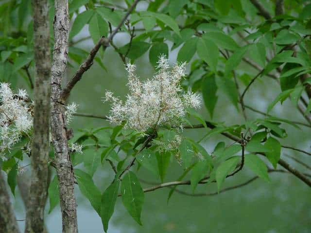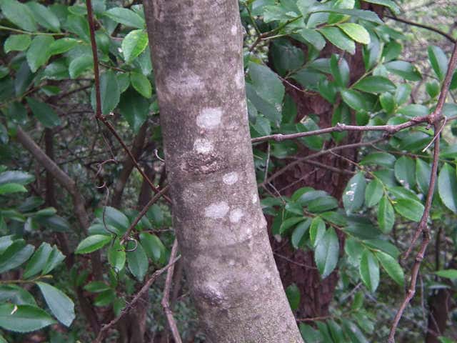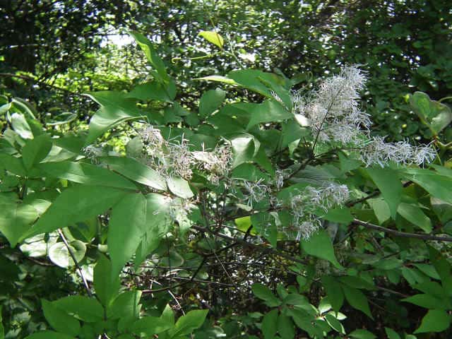 | 落葉高木 北海道〜九州の平地から山地まで、日当たりのよいところにふつうに見られる。高さ5〜15mになる。樹皮は暗灰色。枝は灰褐色。円形の皮目が多い。若い枝には腺毛がある。葉は対生。長さ10〜20cmの奇数羽状複葉。はじめは葉軸と葉柄に微細な毛と短い腺毛がある。小葉はふつう1〜2対、まれに3対あり、長さ5〜10cm、幅1.5〜3.5cmの卵形で、先端はとがり、基部はゆがんだ広いくさび形。裏面の主脈沿いには白い毛がある。雌雄別株。新枝の先に円錐花序を出し、白い花を多数つける。花序には腺毛がある。花冠は4全裂し、裂片は長さ6〜7mmの線形。雄花には2個の雄しべがあり、両性花には雌しべが1個と雄しべが2個ある。果実は翼果。長さ2〜2.7cm、幅4〜5mmの倒披針形。花期は4〜5月。 冬芽の頂芽は長さ4〜6mmの広卵形で、頂生側芽を伴う。芽鱗は1〜2対見え、微細な粉状毛に覆われる。葉痕は半円形。(樹に咲く花) 学名は、Fraxinus sieboldiana モクセイ科トネリコ属 よく似たアラゲアオダモは葉の鋸歯が明瞭。 |