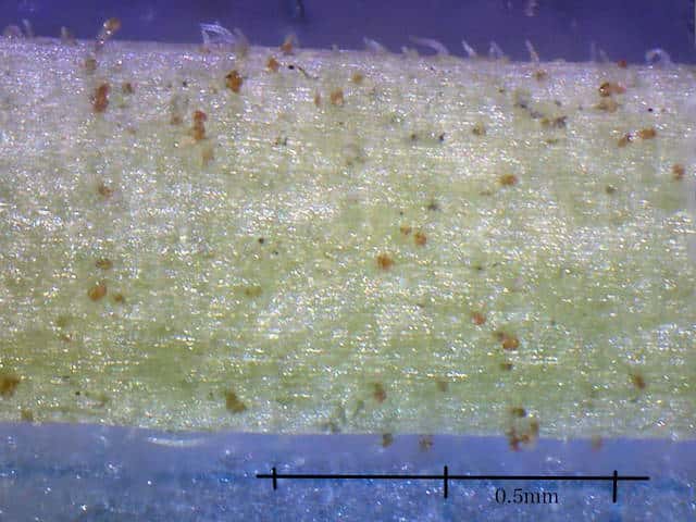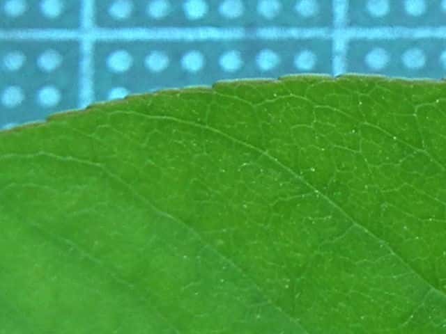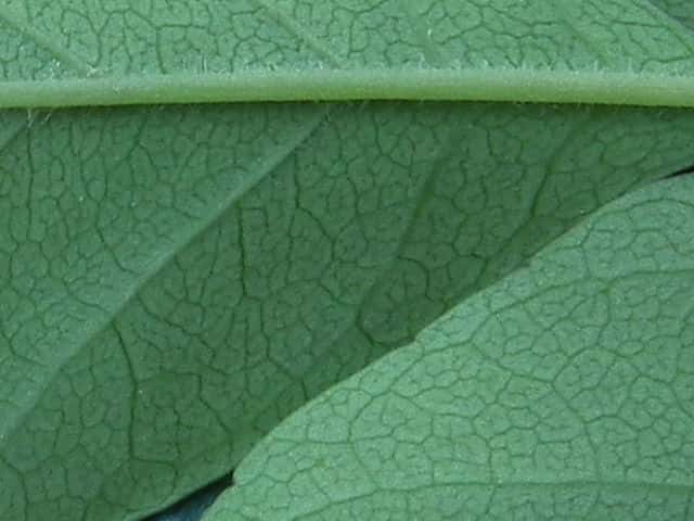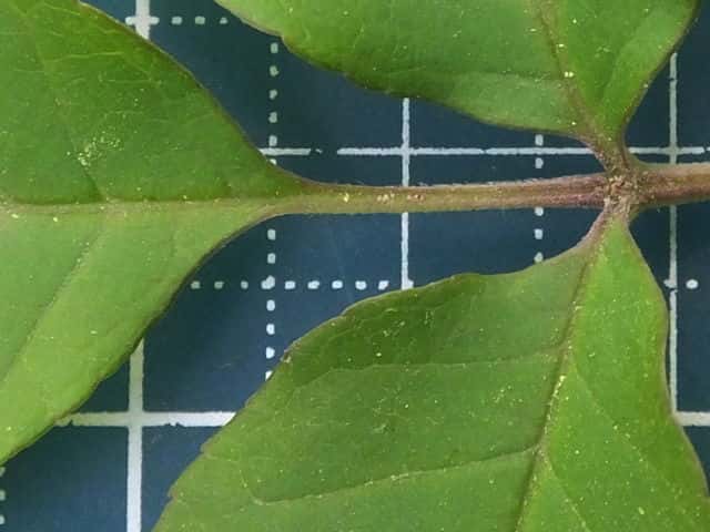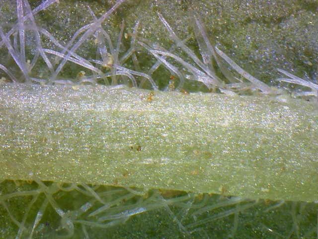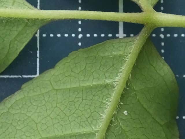 | ▼若葉の葉柄や葉軸に細毛や腺毛がある。 | ▼葉裏面の主脈沿いに白毛がある。 | |