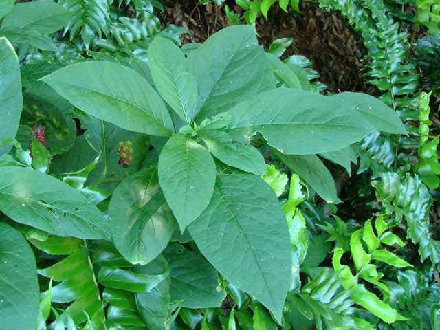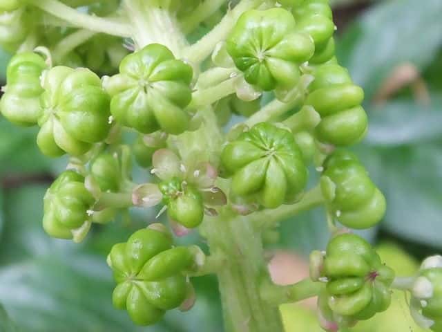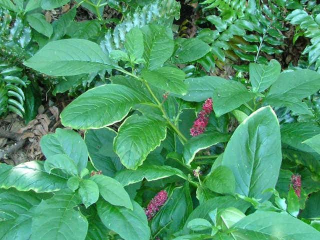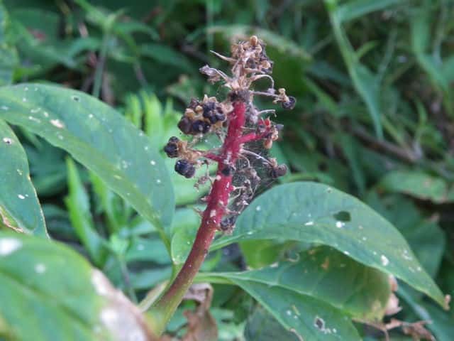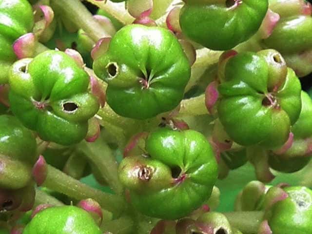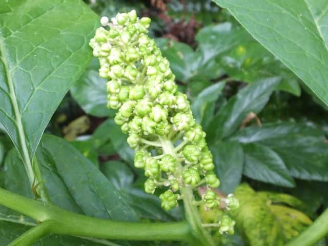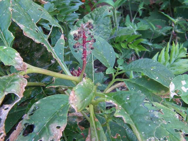 | 多年草 関東地方以西〜九州の山の木陰に生える。茎は太く高さ1m以上に達する。葉は無毛で柄は長さ1.5〜3cm、葉身は長さ15〜30cm、幅5〜10cm、先はやや尾状にとがる。花は直立した総状花序をつくって開き、直径約8mmで淡紅色を帯びる。果実は球状で黒紫色に熟し、種子は腎円形、黒色で光沢があり、細い同心円状の条があり直径約3mm。花期は6〜9月。(原色日本植物図鑑) 学名は、Phytolacca japonica ヤマゴボウ科ヤマゴボウ属 似た花のヤマゴボウは萼が白色で、雄しべの葯が淡紅色、心皮は8個に離生し果実は分果となる。またヨウシュヤマゴボウは果序が垂れ下がる。 心皮は8個で離生、種子は平滑 ・・・・ ヤマゴボウ 心皮は7〜10個で合生、種子には同心円状の線条 ・・・ マルミノヤマゴボウ |