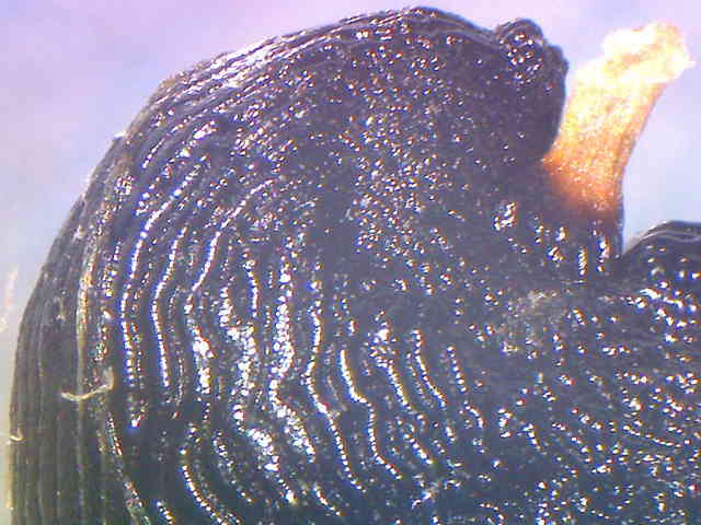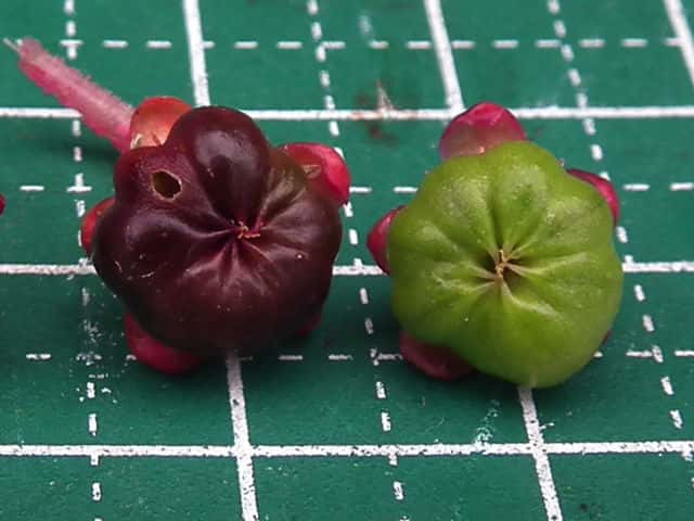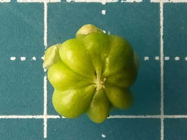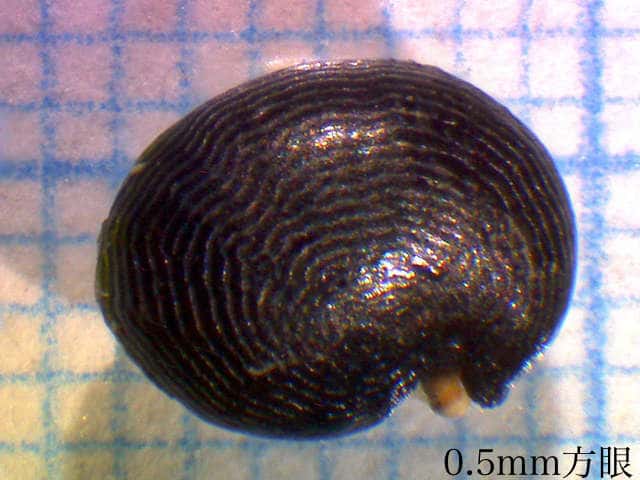 | ▼(少し乾燥した)果実は直径約8.5mm。 | ▼種子は幅約3.5mm、同心円状の溝がある。 | |