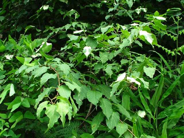 落葉つる性木本 北海道〜九州の山地に生える。葉は互生し、長さ約10cmの卵円形、裏面は淡緑色。花期には枝先きの葉が白くなる。葉腋に白い5弁の花をつける。花は雄花、雌花、両性花がある。雄花は1〜3個。雌花と両性花は1個ずつつく。果実は長楕円形で先がとがり、黄熟する。しばしば虫えいができる。花期は6〜7月。 冬芽は、半隠芽。隆起した葉枕に埋もれ、先端だけ見える。葉痕は円形で、維管束は1個。 学名は、Actinidia polygama マタタビ科マタタビ属 |