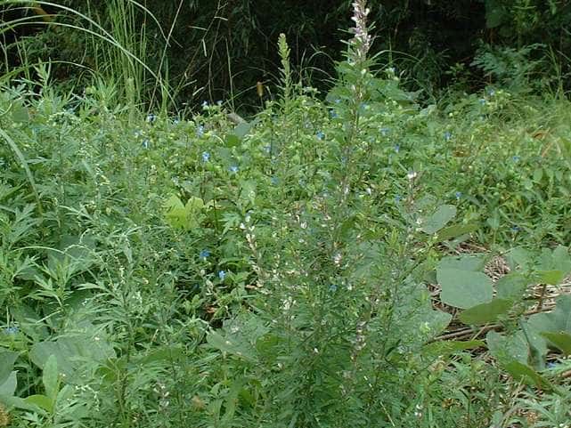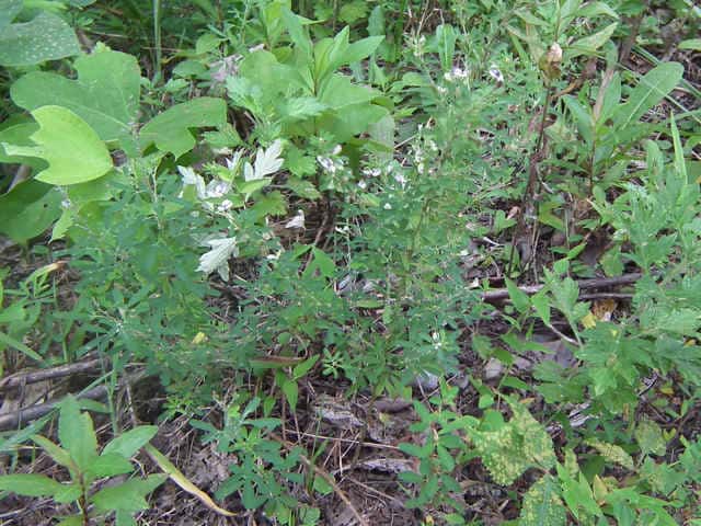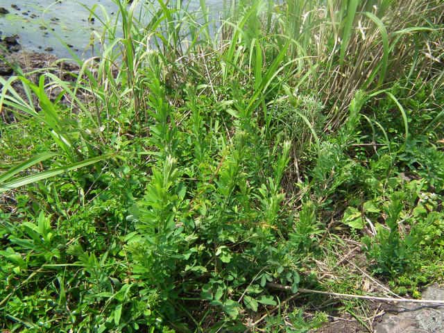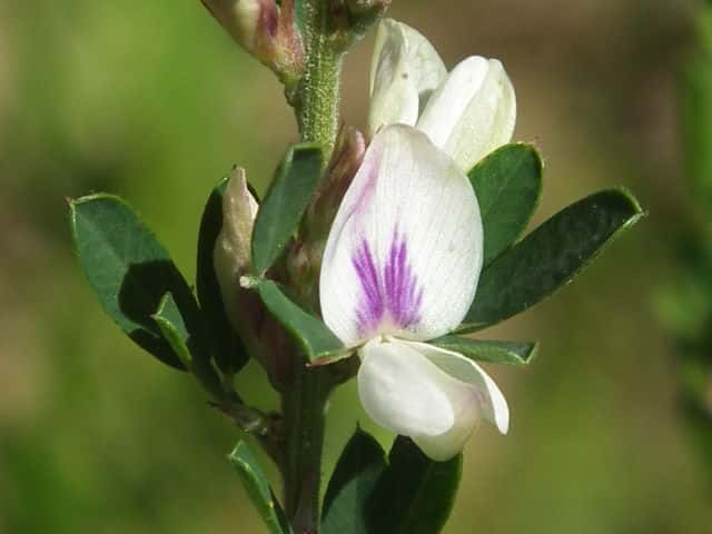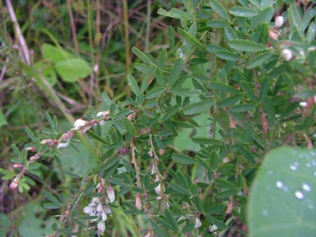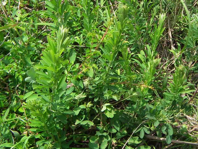 | 多年草 日本全土の日当たりのよい草地や道ばたに生える。茎は高さ0.6〜1mになり、やや木質化し、伏毛がある。葉は3小葉からなり、茎に密生する。小葉は長さ1〜2.5cm、幅2〜4mmのくさび形〜倒披針形で、裏面には伏毛がある。花は葉腋に数個ずつつき、黄白色で長さ6〜7mm。旗弁に紅紫色の斑点がある。閉鎖花も葉腋に数個ずつつく。豆果は扁平な円形または広楕円形。中には種子が1個入り、熟しても裂けない。花期は8〜10月。(野に咲く花) 学名は、Lespedeza cuneata マメ科ハギ属 変種にハイメドハギがある。茎が地を這い、茎の毛が開出し、小葉が短い。旗弁全体、他の弁の先が紫色を帯びる。 |