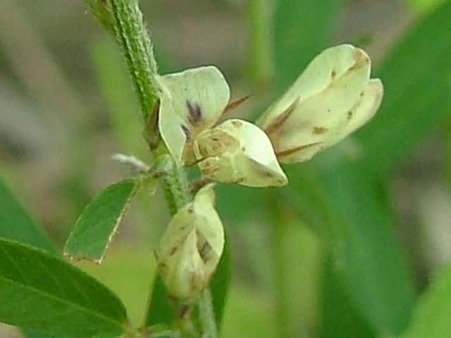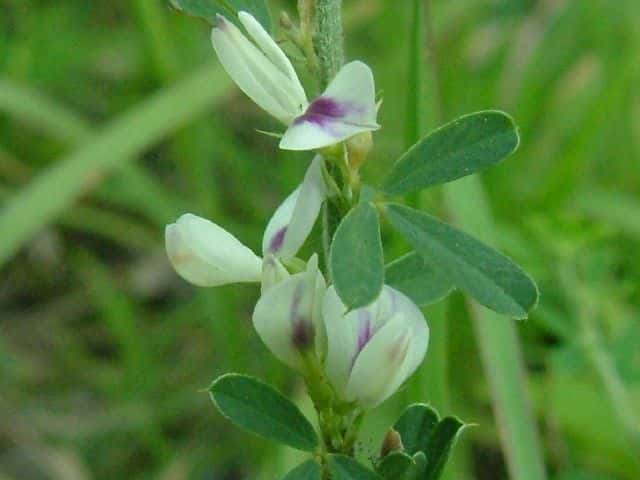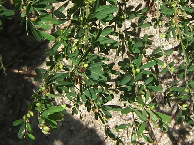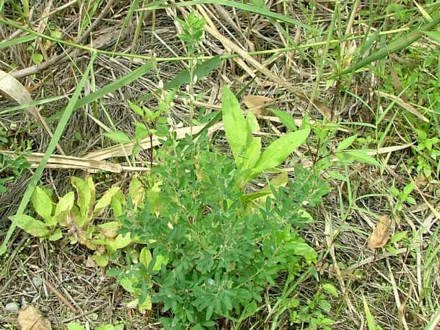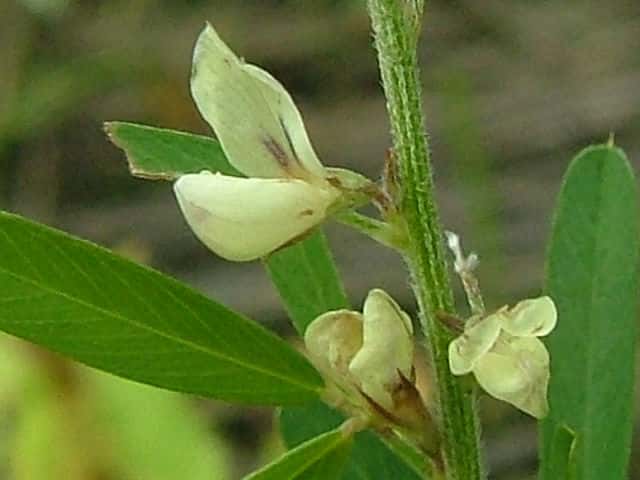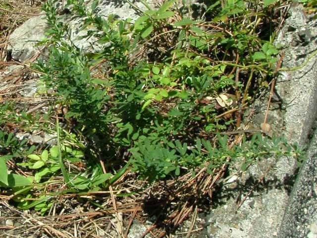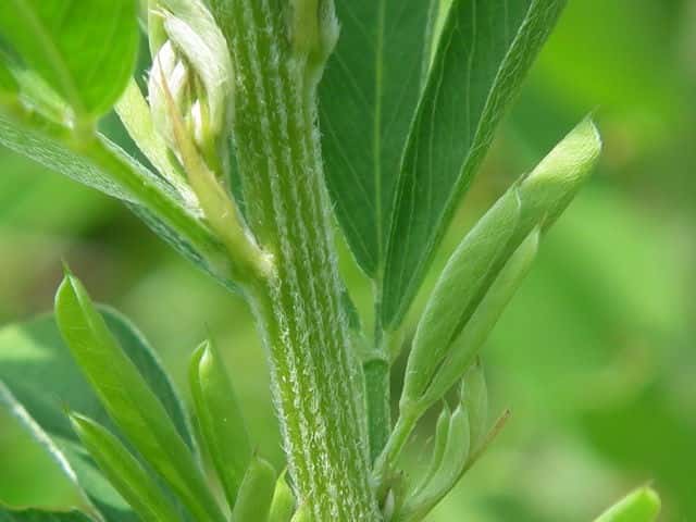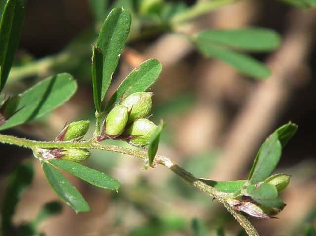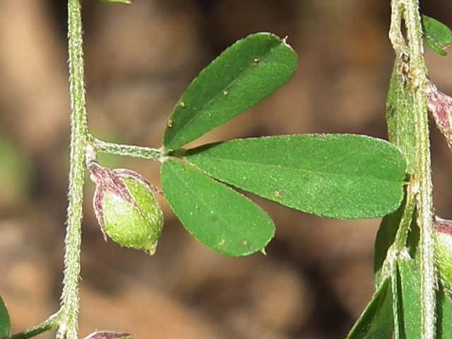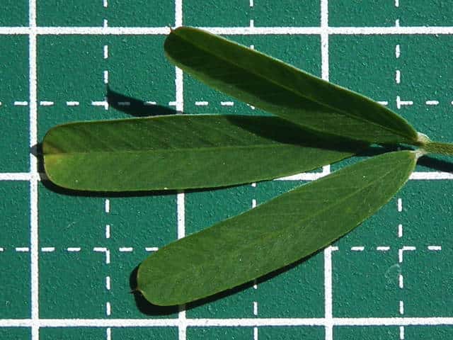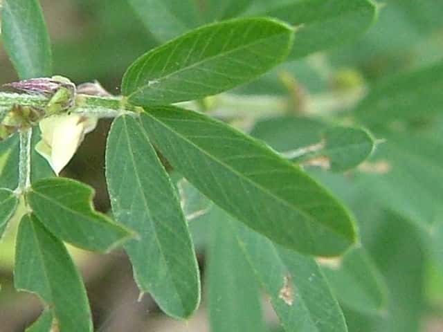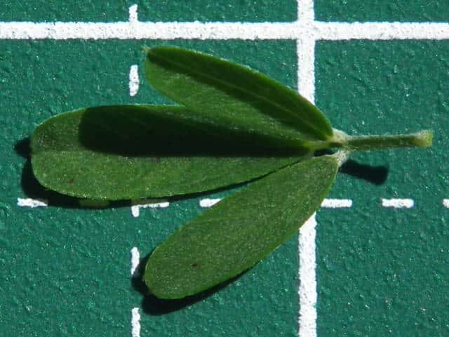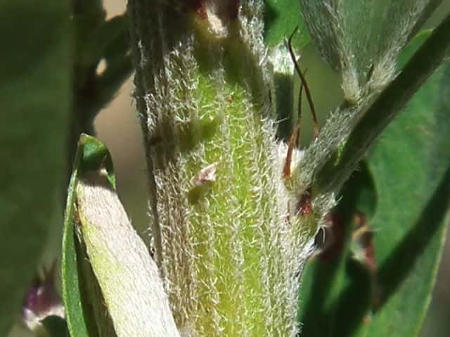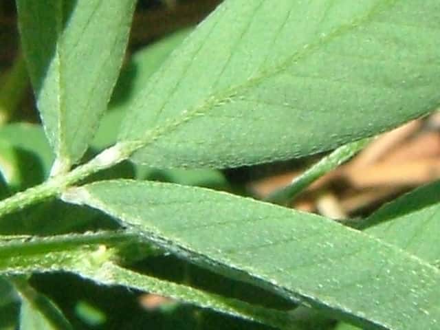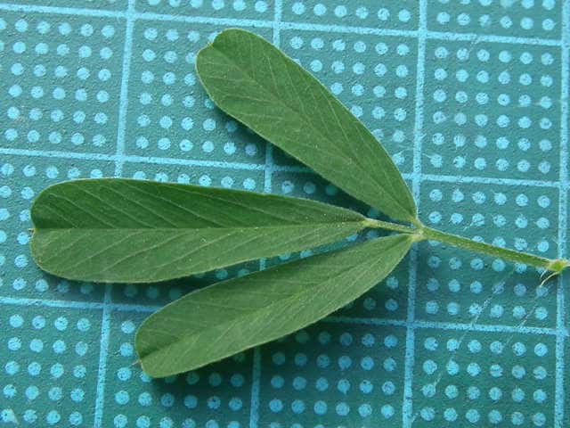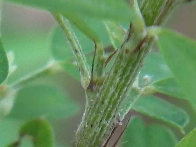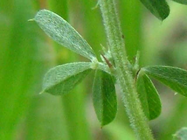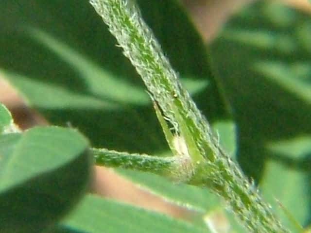 | ▼上部の葉の小葉は長さ約8mm。 | ▼茎には稜があり、伏毛がある。托葉は線形。 | |