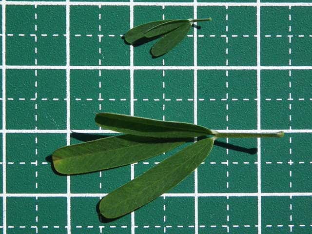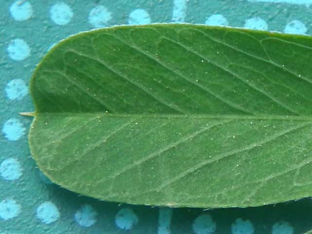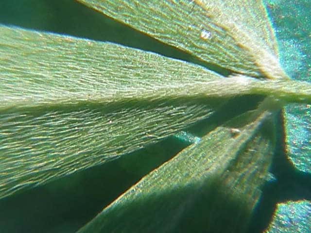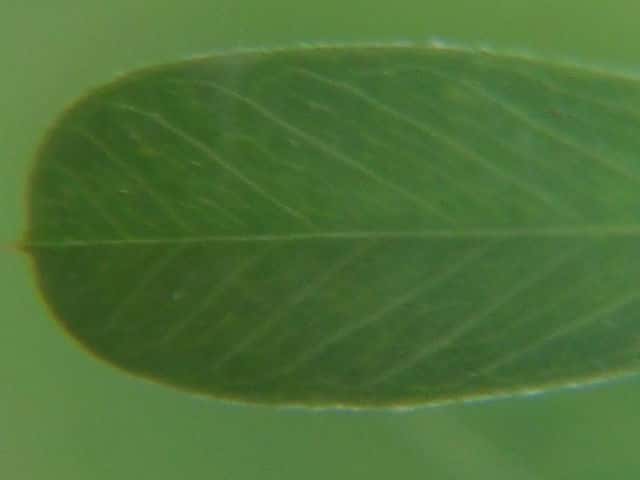 | ▼上部の葉(上)、下部の葉(下)。 | ▼下部の葉の小葉は長さ約2.3cm。 | ▼小葉の先端は芒状突起があり、短毛がある。 |