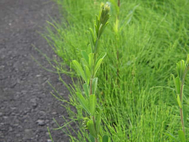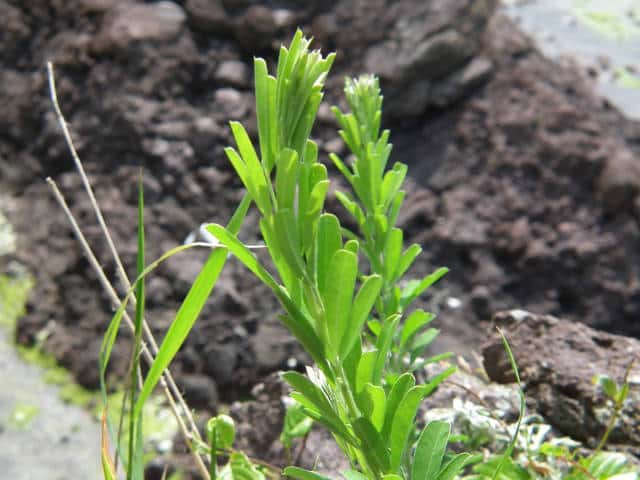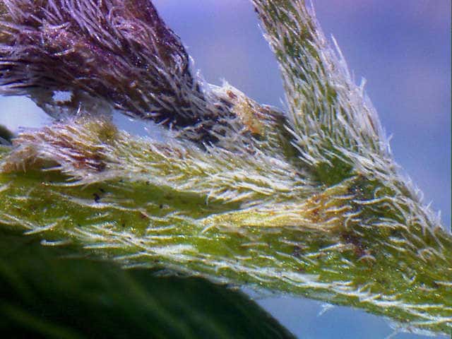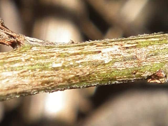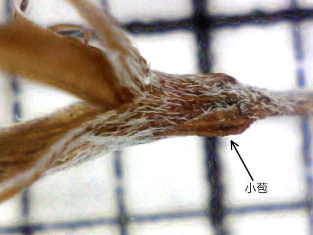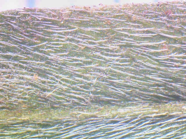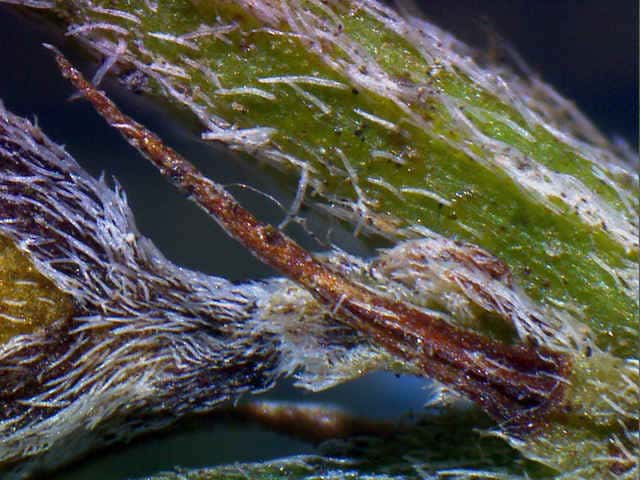 | ▼線形、長さ約2mmの長い托葉。 | ▼上部の枝には上向きの伏毛が密生する。 | ▼基部の茎。 |