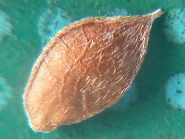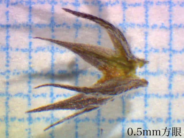 | ▼果実は長さ約4mm。表面に毛がある。 | ▼果実に種子は1個入る。 | ▼種子は長さ約2mm。 |