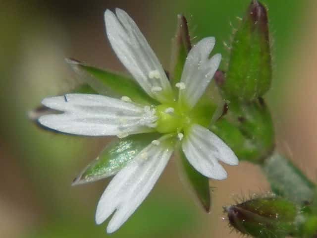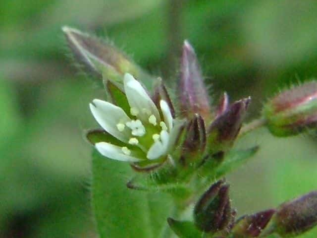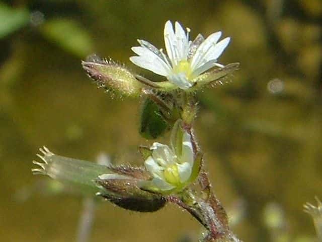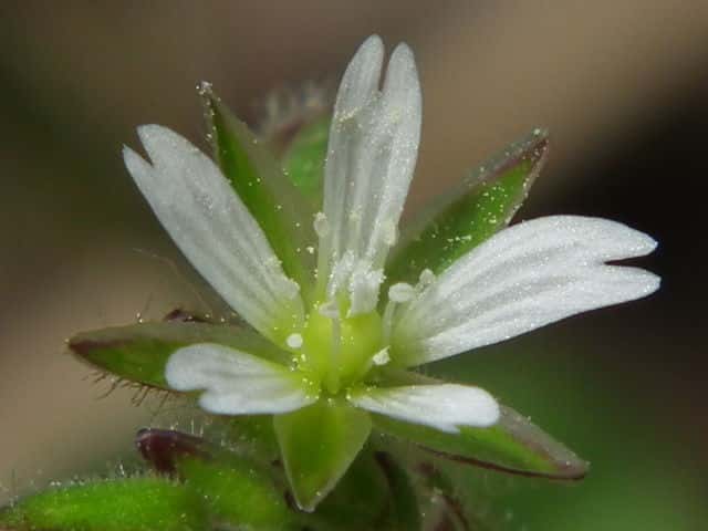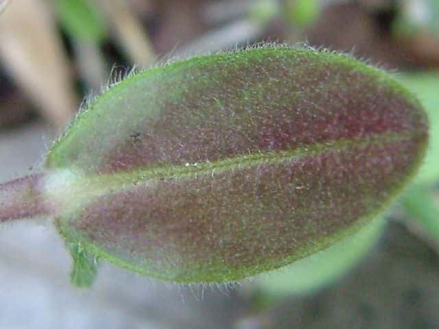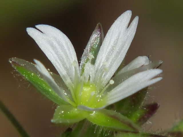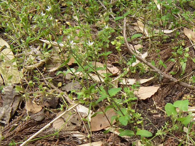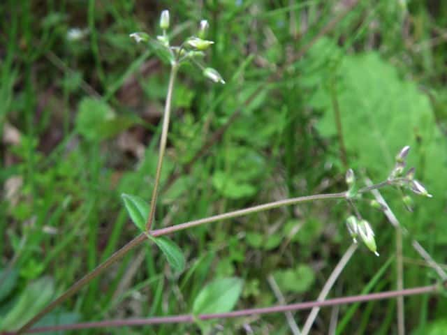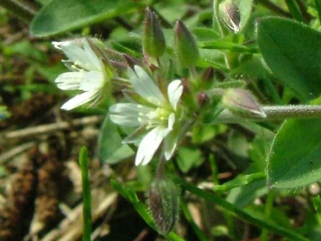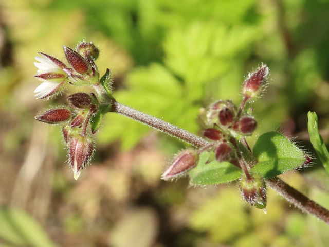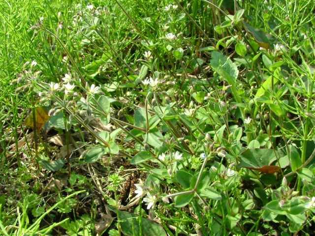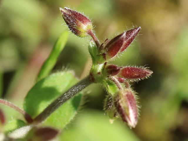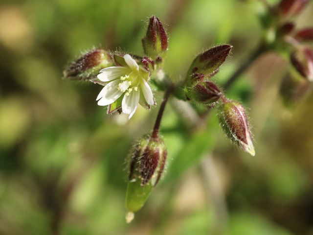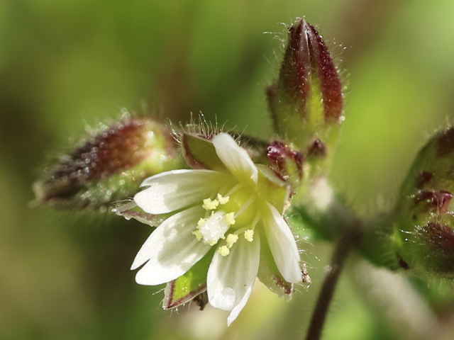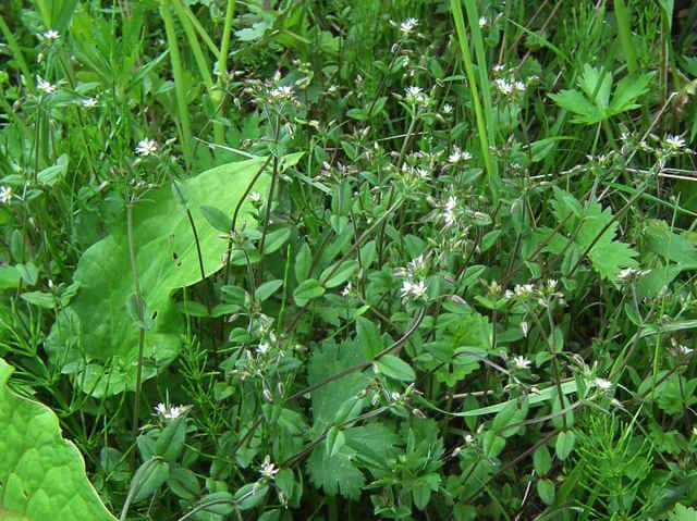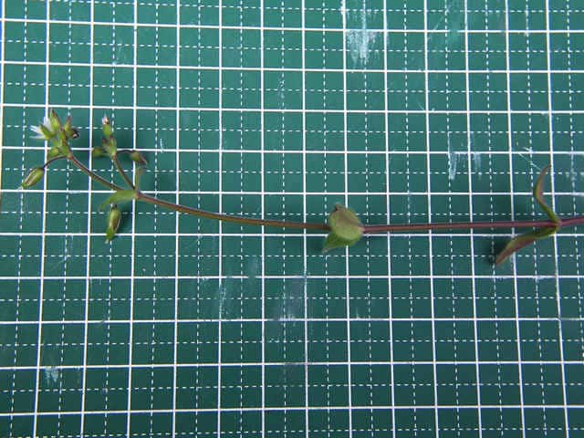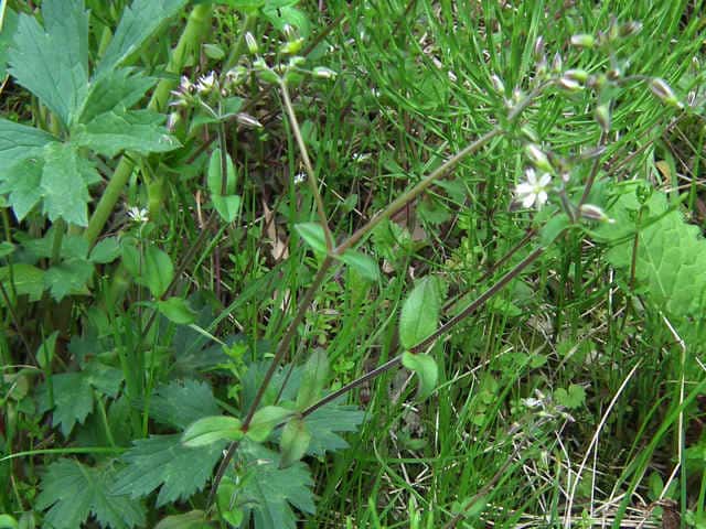 越年草 北海道〜九州の道ばたや田畑にふつうに生える。茎は下部から分枝して叢生し、高さ15〜30cm、密に毛があり、上部には腺毛が少しまじる。葉は卵形から長楕円形、鈍頭、長さ1〜4cm、両面に毛がある。花は大きな集散花序につく。花柄は5〜14mm、花後下に曲がる。萼片は5、長楕円形、長さ4〜5mm、毛と腺毛がある。花弁は5、白色、長楕円形、先は2裂し、長さ4〜5mm。雄しべは10、花柱5。果実は8mm、先は10裂し、裂片は立ち、ふちが外にまがる。種子は卵形、長さ0.6mm、小突起があり褐色。花期は5月。(原色日本植物図鑑) 学名は、Cerastium holosteoides var. hallaisanense ナデシコ科ミミナグサ属 よく似たオランダミミナグサは小花柄が短く、ほとんど茎に接して咲く。種子は長さ約0.5mm。 |