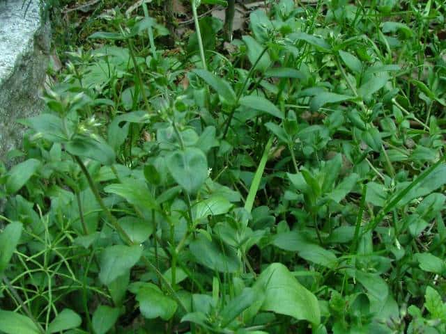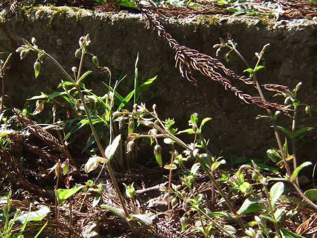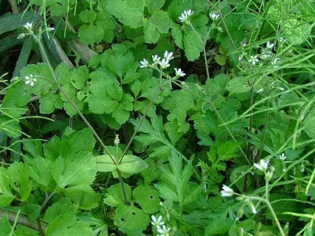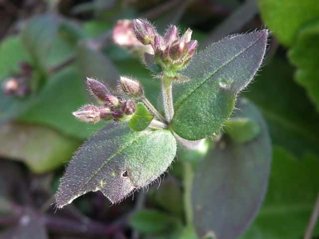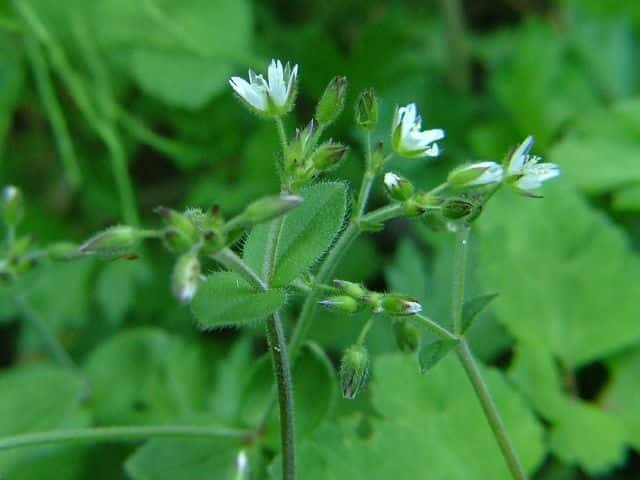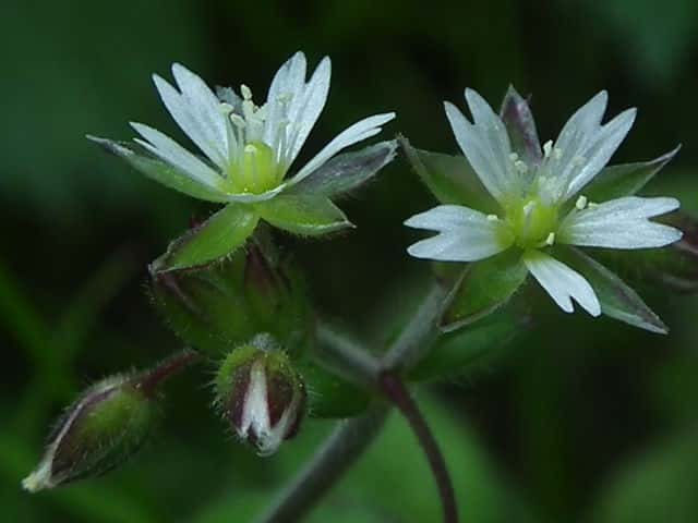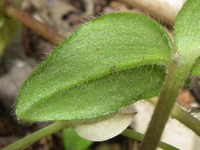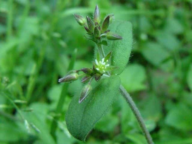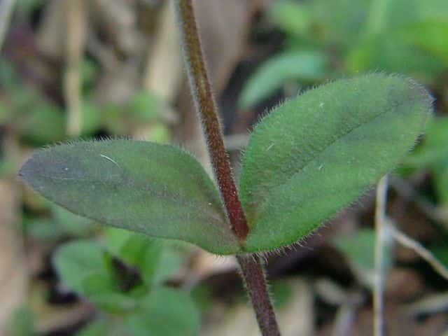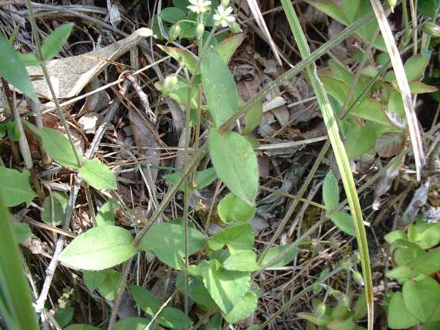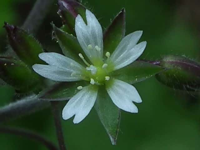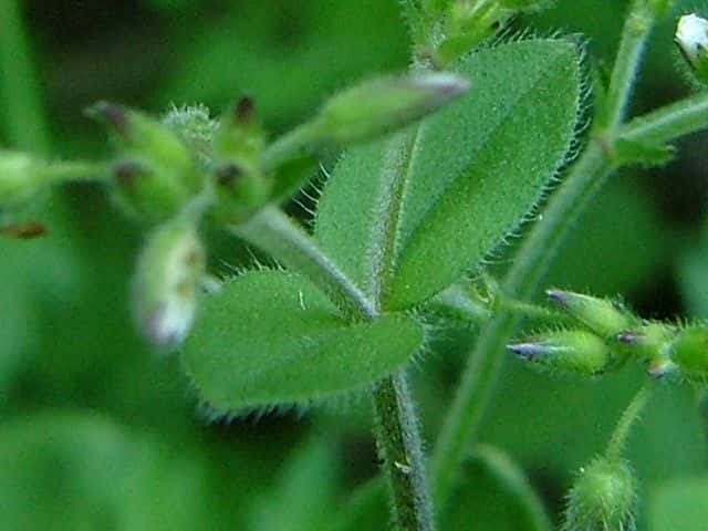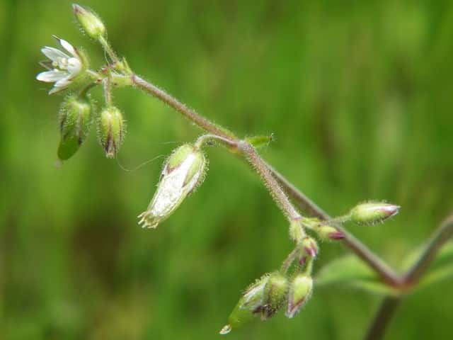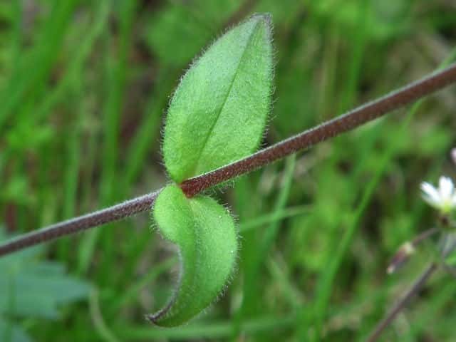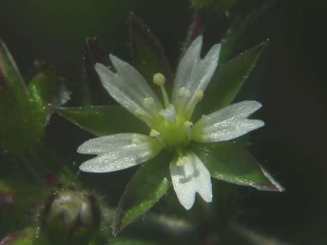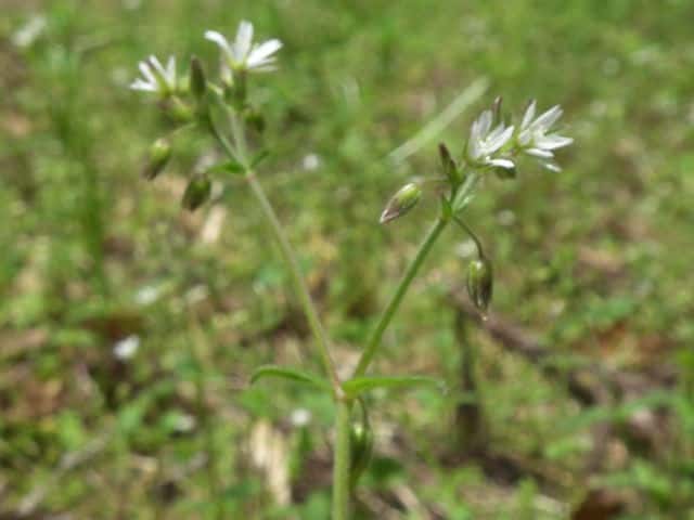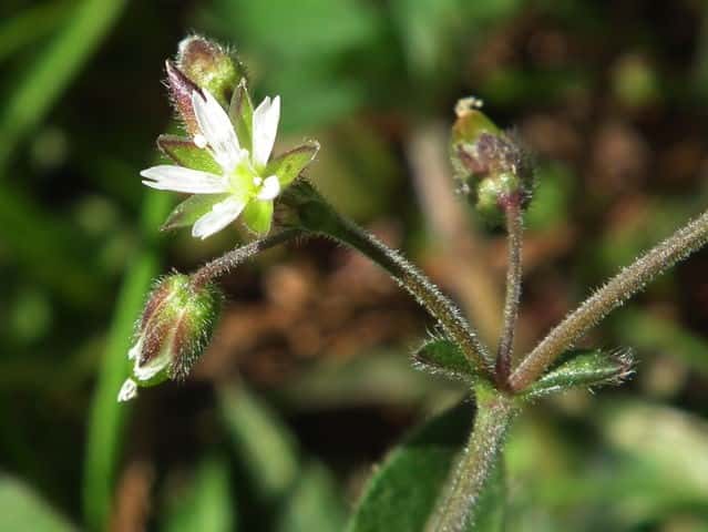 越年草 北海道〜九州の道ばたや田畑にふつうに生える。茎は下部から分枝して叢生し、高さ15〜30cm、密に毛があり、上部には腺毛が少しまじる。葉は卵形から長楕円形、鈍頭、長さ1〜4cm、両面に毛がある。花は大きな集散花序につく。花柄は5〜14mm、花後下に曲がる。萼片は5、長楕円形、長さ4〜5mm、毛と腺毛がある。花弁は5、白色、長楕円形、先は2裂し、長さ4〜5mm。雄しべは10、花柱5。果実は8mm、先は10裂し、裂片は立ち、ふちが外にまがる。種子は卵形、長さ0.6mm、小突起があり褐色。花期は5月。(原色日本植物図鑑) 学名は、Cerastium holosteoides var. hallaisanense ナデシコ科ミミナグサ属 よく似たオランダミミナグサは小花柄が短く、ほとんど茎に接して咲く。種子は長さ約0.5mm。 |