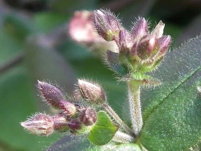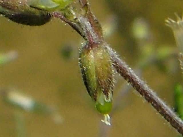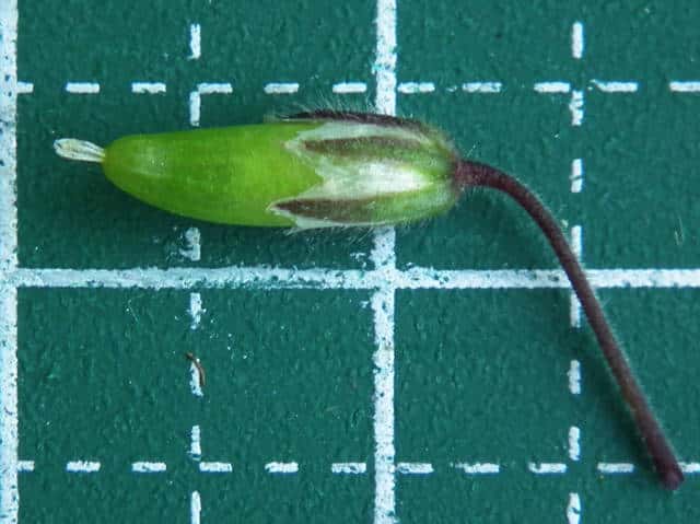 | ▼果柄や萼に腺毛が多い。 | ▼裂開した果実は、長さ約1cm。 | ▼種子は直径約0.8mmで、小突起がある。 |